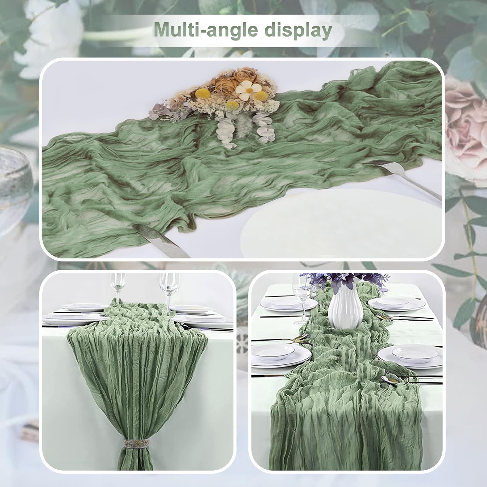 - User-Friendly: We understand the importance of convenience for our customers. Our sage green rustic sheer table runner is easy to clean and maintain. They can be machine washed or hand washed without losing their shape or color. The lightweight and flexible nature of the cheesecloth and gauze make them easy to handle and store, saving you space and effort.