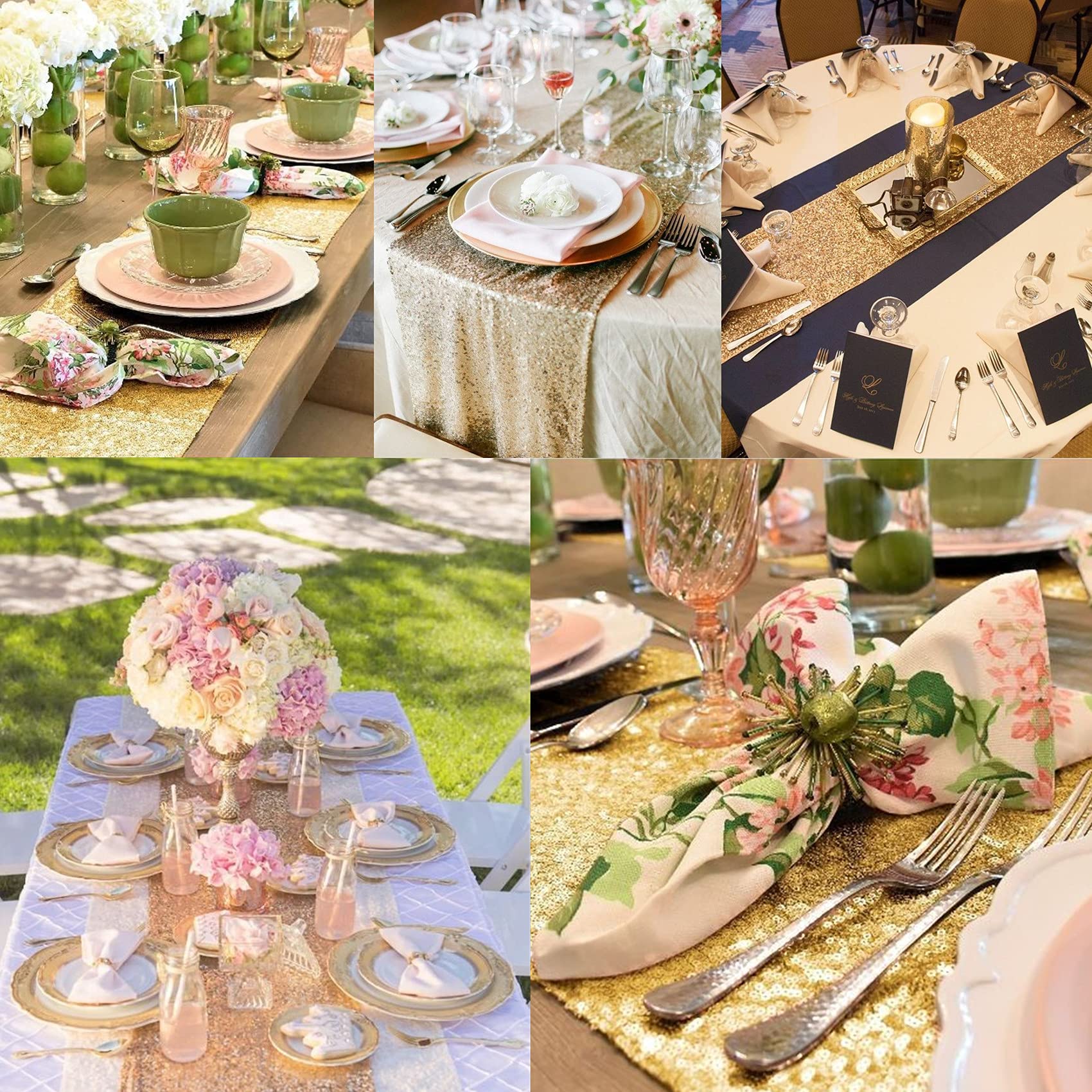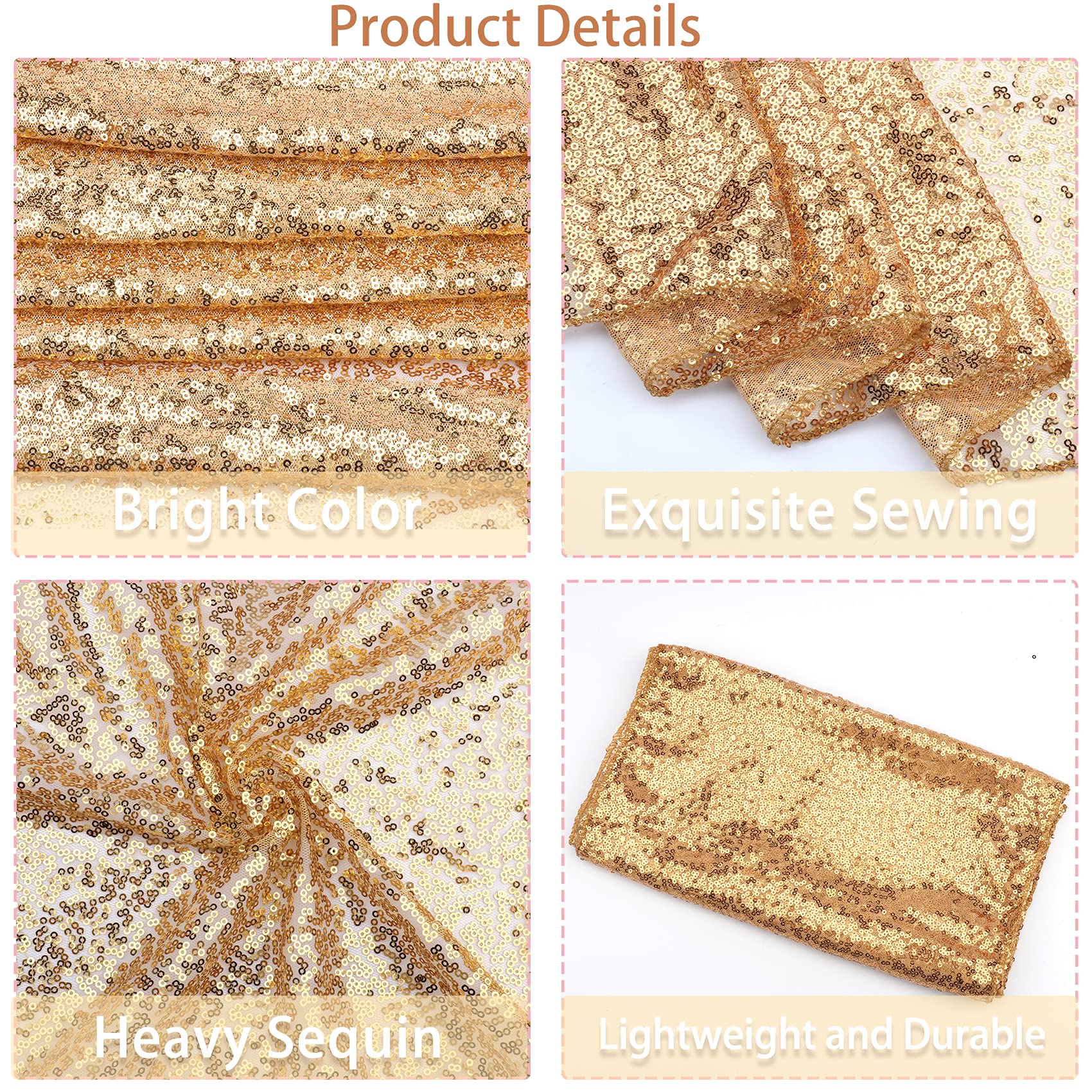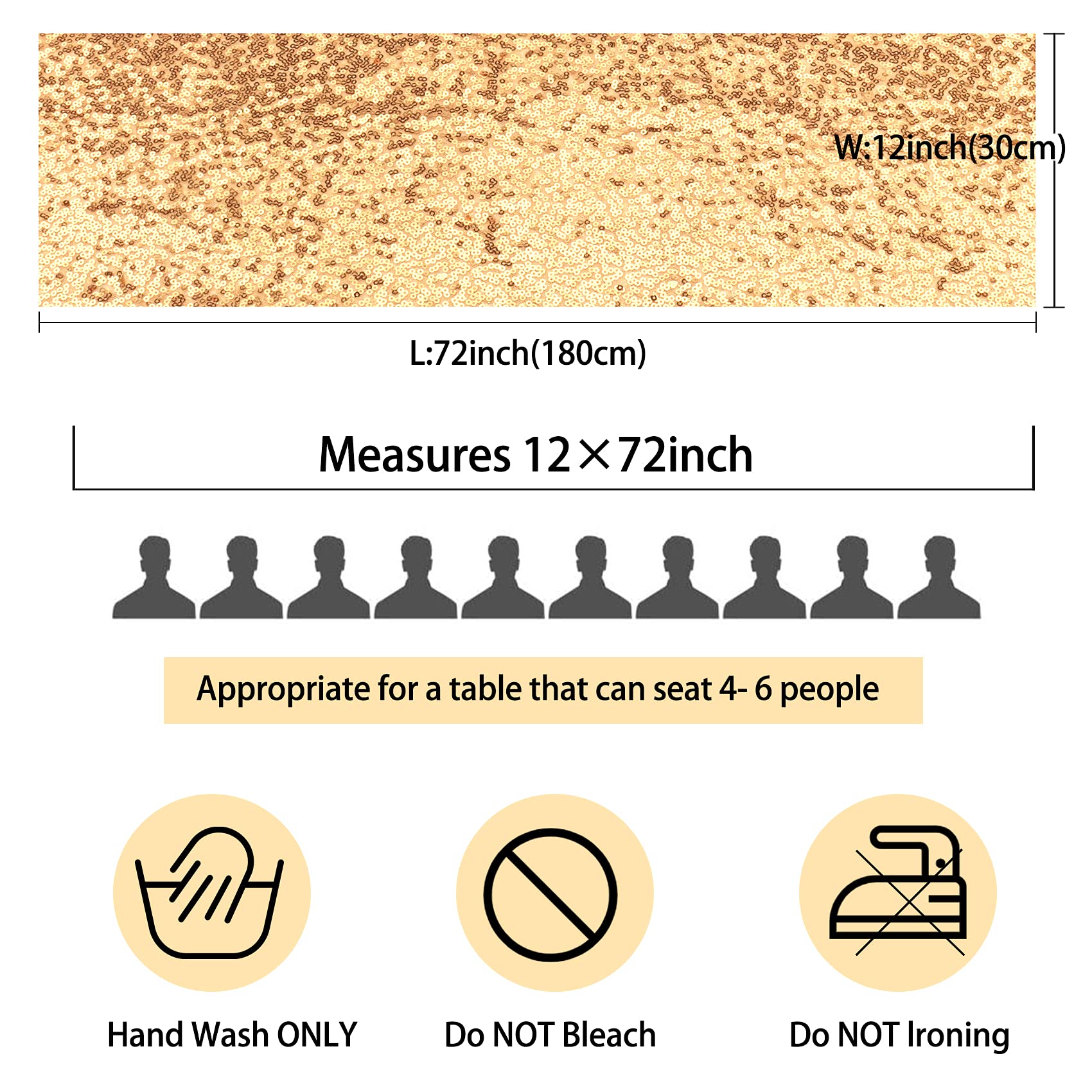 - Package Include: you will get 12 pieces champagne gold sequin table runner, enough quantity is suitable for wedding banquets and various parties, the size of each table runner is approximately 12 x 72 inches / 30 x 180 cm, which is large enough to cover rectangles and round tables, can also be spliced together for long tables.