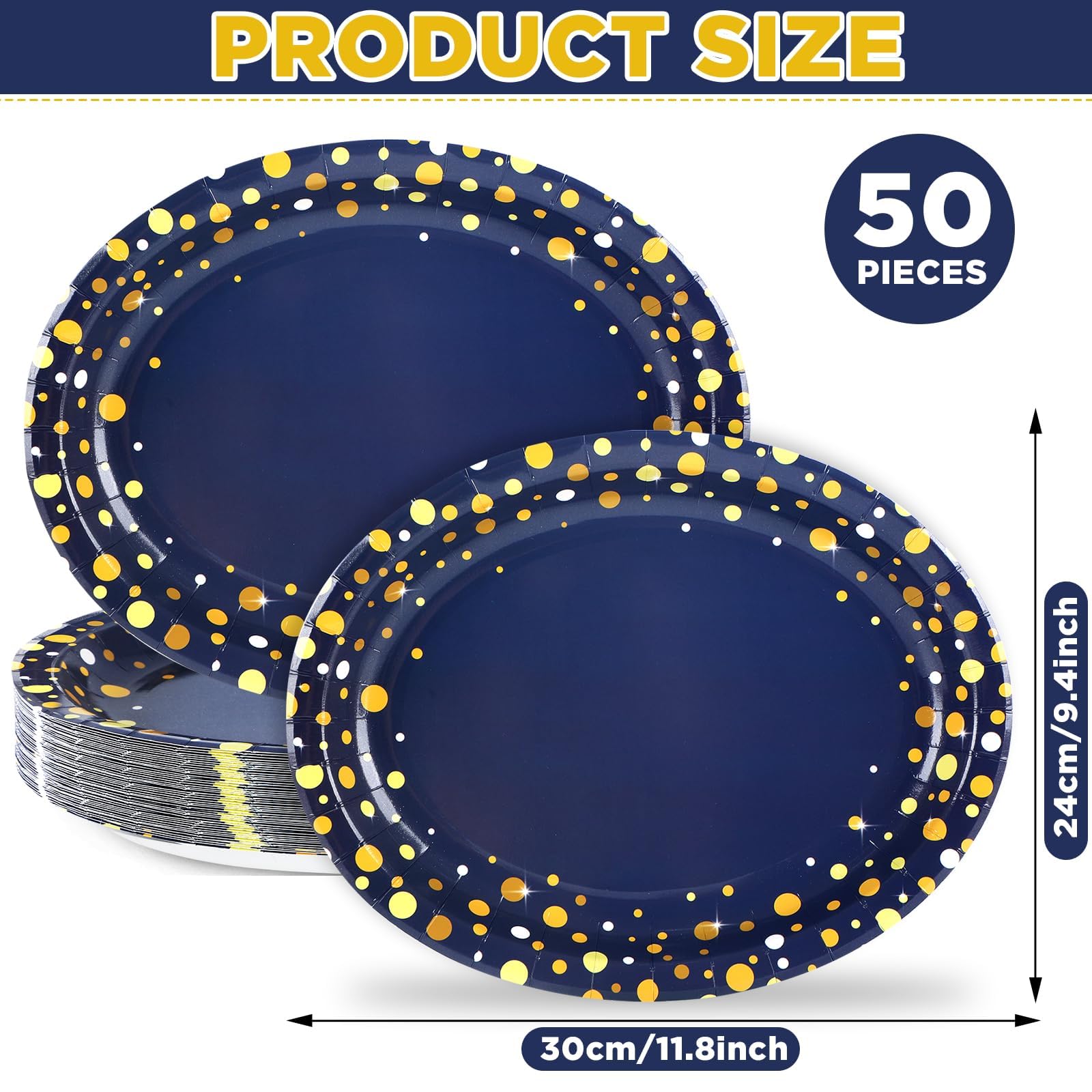 - Package includes: The deep blue and gold party decorations set contains 50pcs 11.8x9.4 inches blue and gold oval plates, can serve 50 guests. It's enough for daily use or parties. Impress your guests and bring a vibrant touch to your table setting.