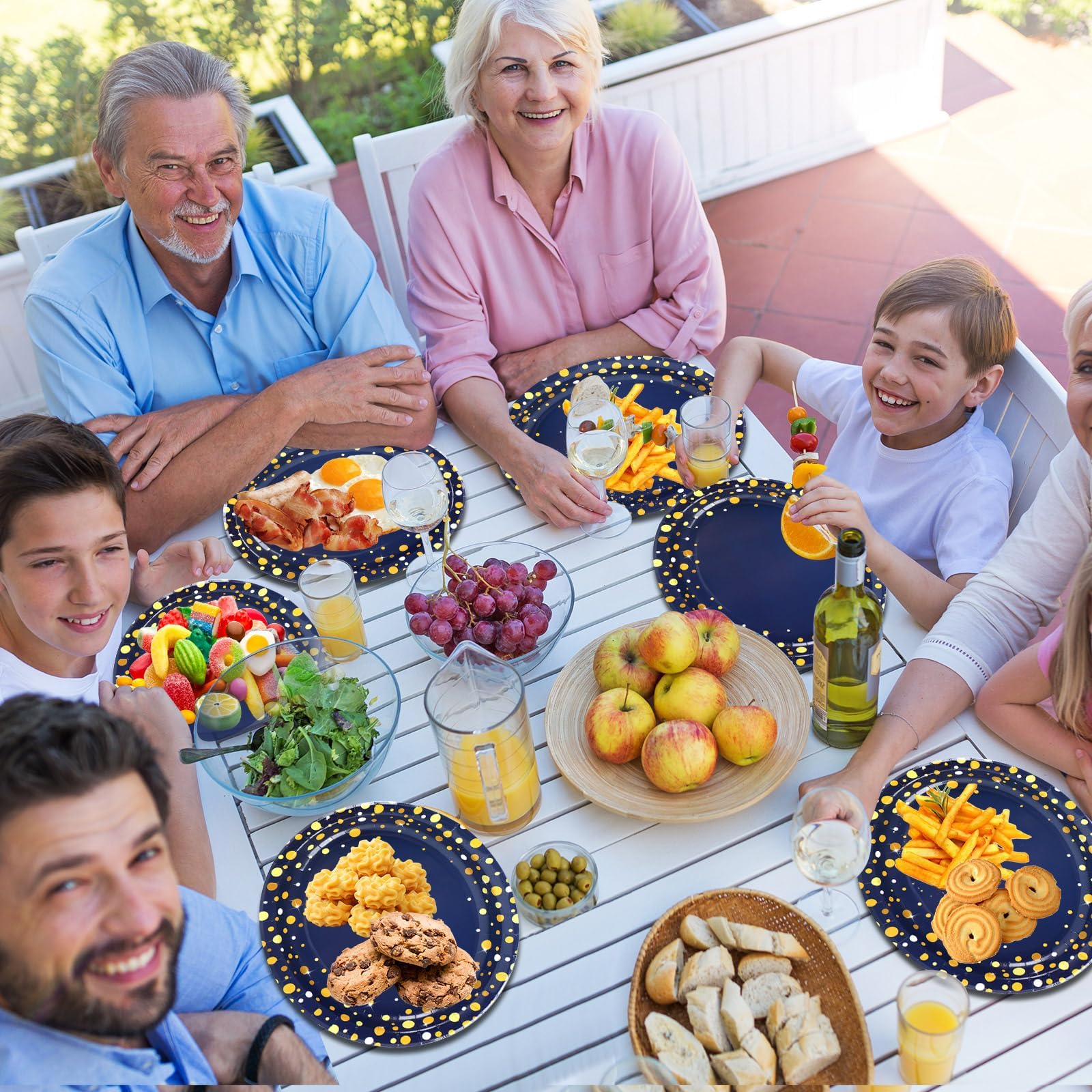 - Save the hassle of cleaning: When the party ends, these disposable golden dot blue party plates can be easily discarded, saving you the trouble of washing up. Enjoy more quality time with your family and friends instead of dealing with cleanup.