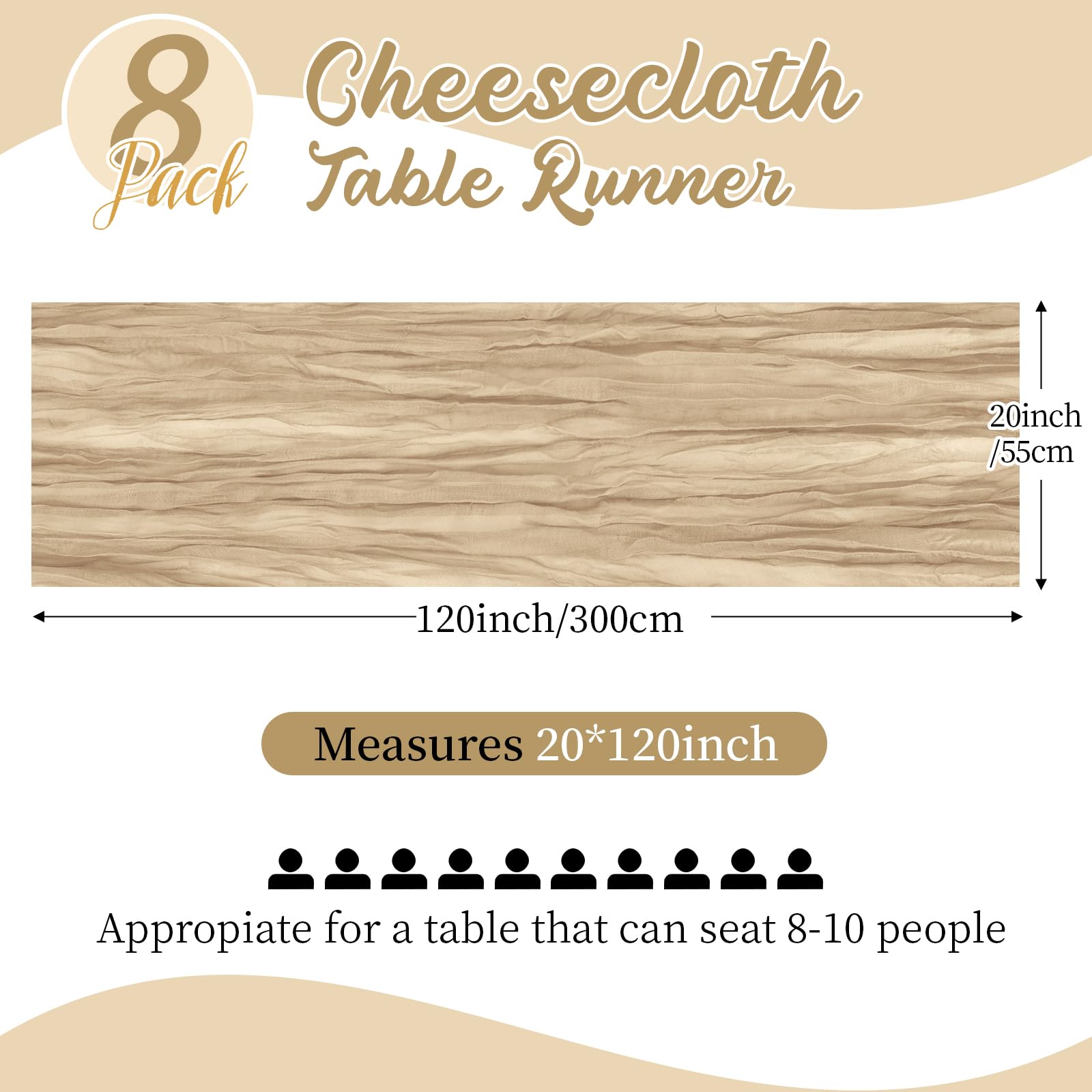 - Package Included: You will get 8 pack of beige cheesecloth table runners, enough to meet your daily use and replacement needs. The size of each cheese cloth table runner is about 20 x 120 inches, it's long enough to fit different size tables and chairs. A variety of colors for you to choose from, perfect for weddings and parties, adding a romantic atmosphere to your occasion