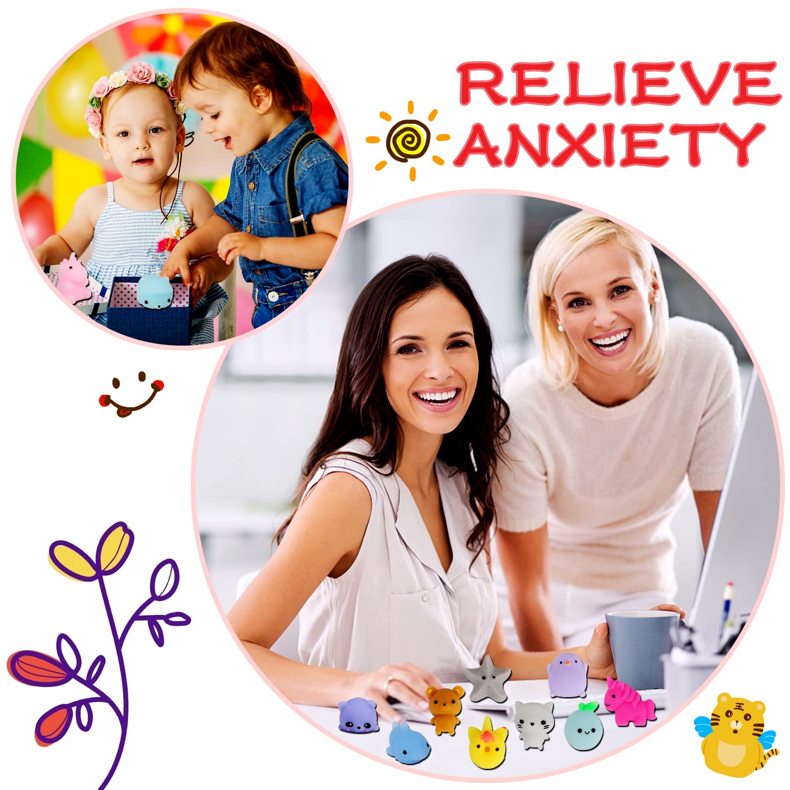 - Stress Relief Toys-these mochi fidget toys are so cute to make you smile like desk pet, you can play with them, decorate your desk, or squeeze them to get your anger, anxiety, stress out to help you turn to good mood. They are also good for autism children as sensory toys.