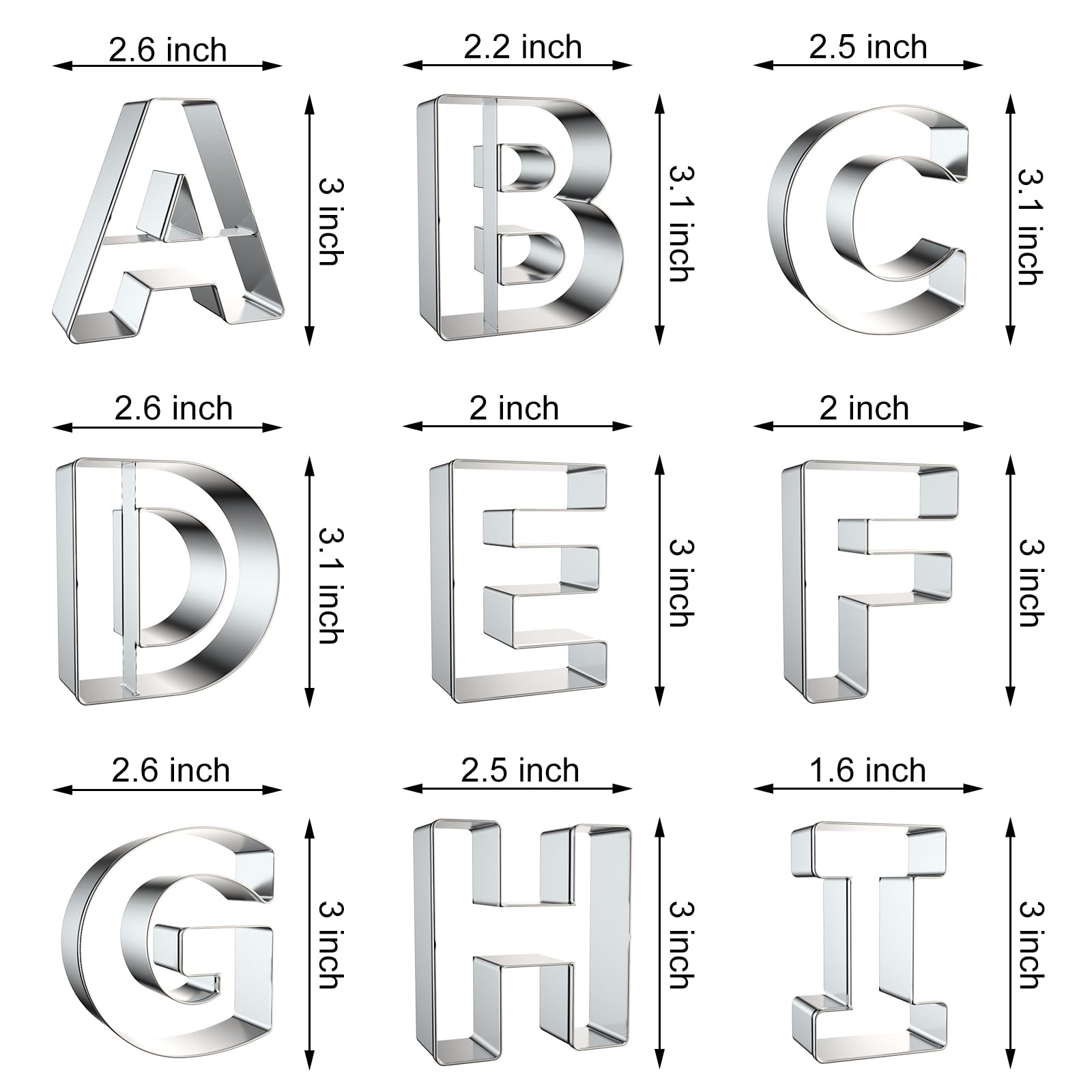 - ALPHABET LETTERS COOKIE CUTTER SET - This set of cookie cutters includes 26 capitalized letter shapes (A B C D E F G H I J K L M N O P Q R S T U V W X Y Z). It is perfect for any occasion! Birthdays, Valentine's Day, weddings, Easter, baby showers, Halloween, Thanksgiving, Christmas, holidays, anniversaries, you name it! Get ready to decorate cookies for your party with this funny set.