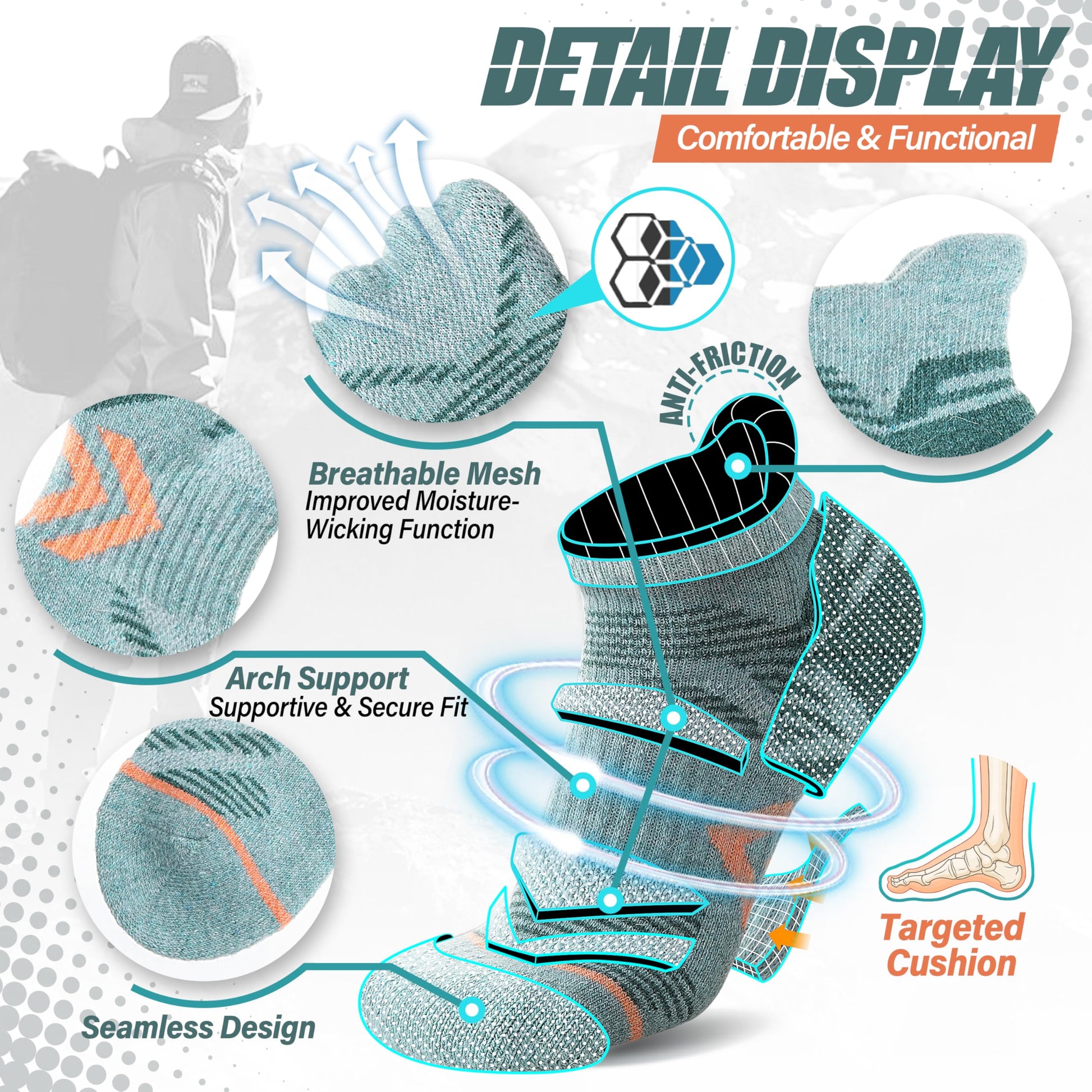 - GENTLE COMPRESSION SUPPORT :The hiking wool socks incorporates a gentle compression support technology (8-10mmHg), and a compression stripe is designed on the calf and the arch , so that the socks can fit the feet snugly and keep the socks in place,It can also enhance blood circulation , relieve symptoms varicose , reduce fatigue and help in muscle recovery. They are perfect socks for hiking , climbing , running , walking or other outdoor activities.