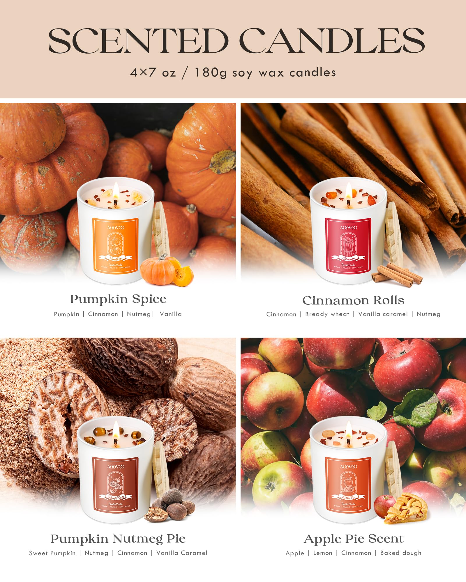 AOOVOO Fall Candles Set for Women - 4 Pack Candles for Home Scented, Aromatherapy Candle with Crystals Inside, 28 oz 200 Hour Long Lasting, Autumn Fragrance of Apple Pie/Cinnamon/Pumpkin/Nutmeg Beans