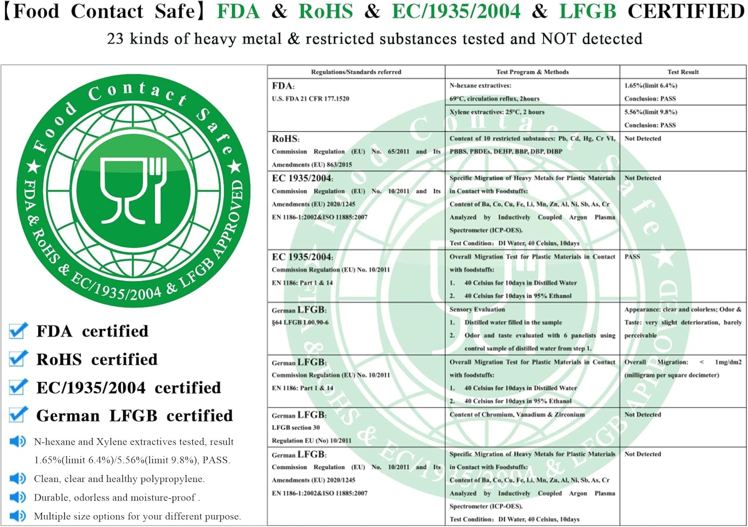 - Food contact safe: FDA & RoHS & EC/1935/2004 & German LFGB certified, made of new polypropylene material (OPP), please feel free to use. 23 kinds of heavy metal/restricted substances tested and NOT detected. N-hexane and Xylene extractives tested, result 1.65%(limit 6.4%)/5.56%(limit 9.8%).