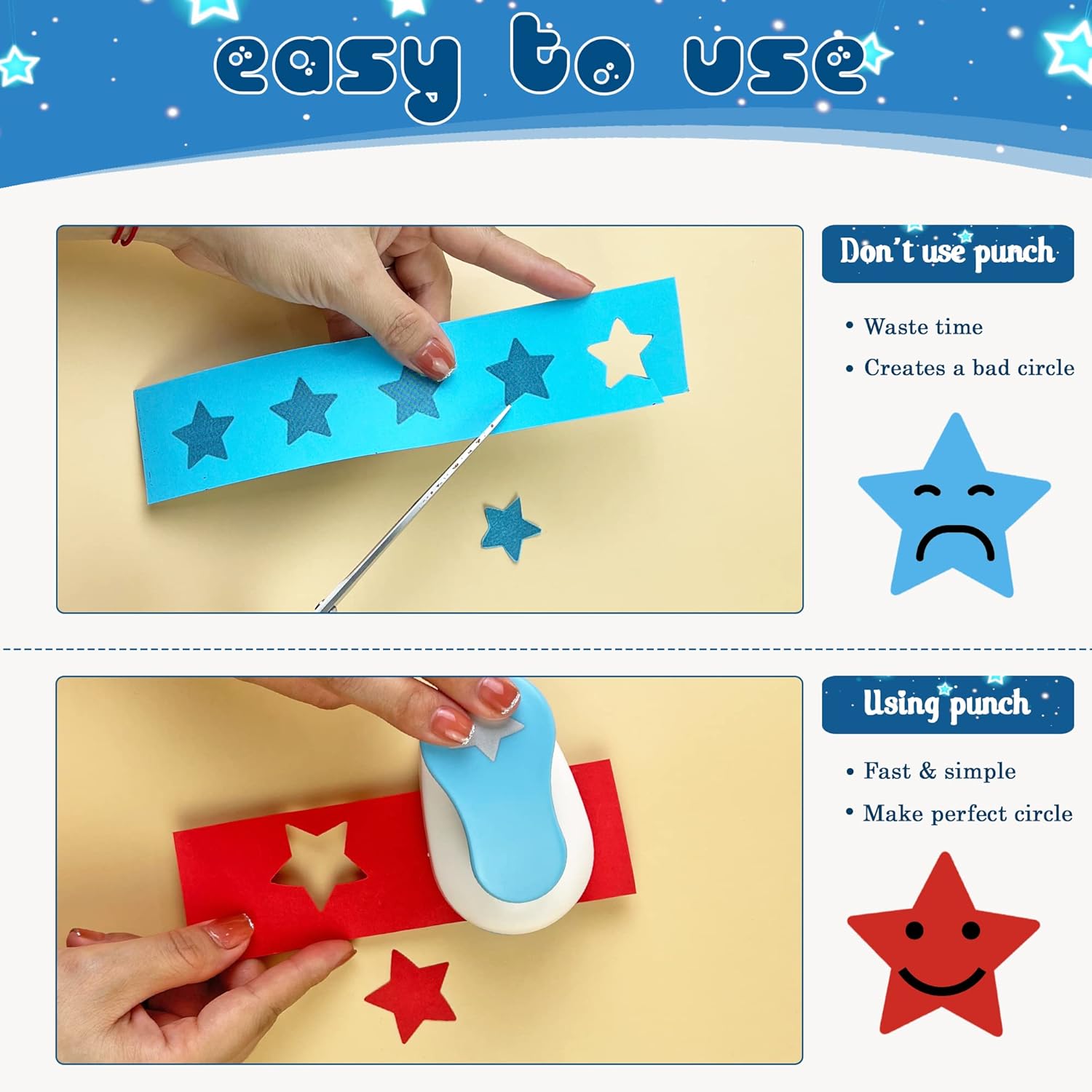 • ❤ ROMANTIC & ADORABLE: These craft star punches can help you create crisp, star shaped designs from card-stock, paper, cardboard and more, adorable embossed patterns are sure to add romantic and warm elements for your different craft works.