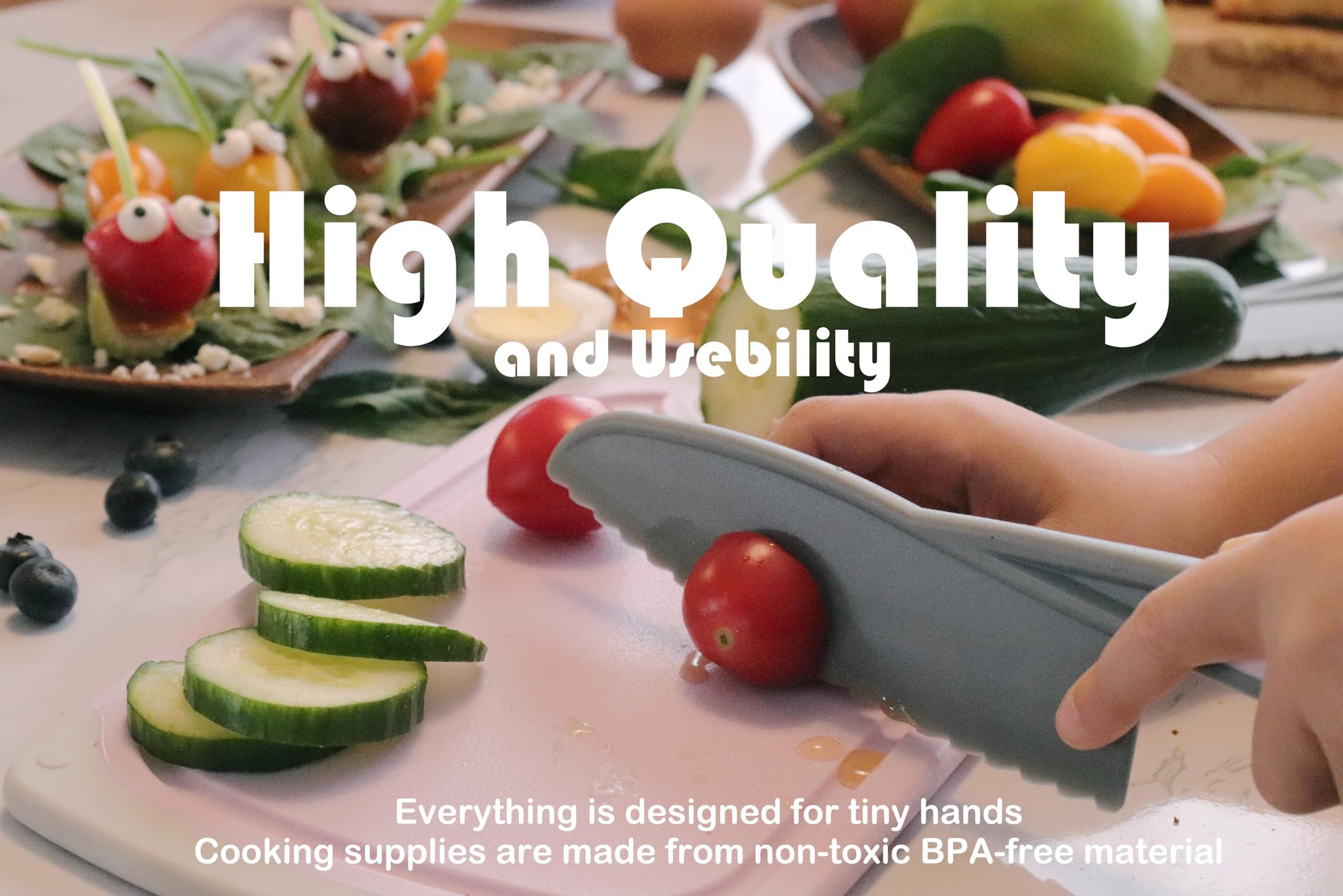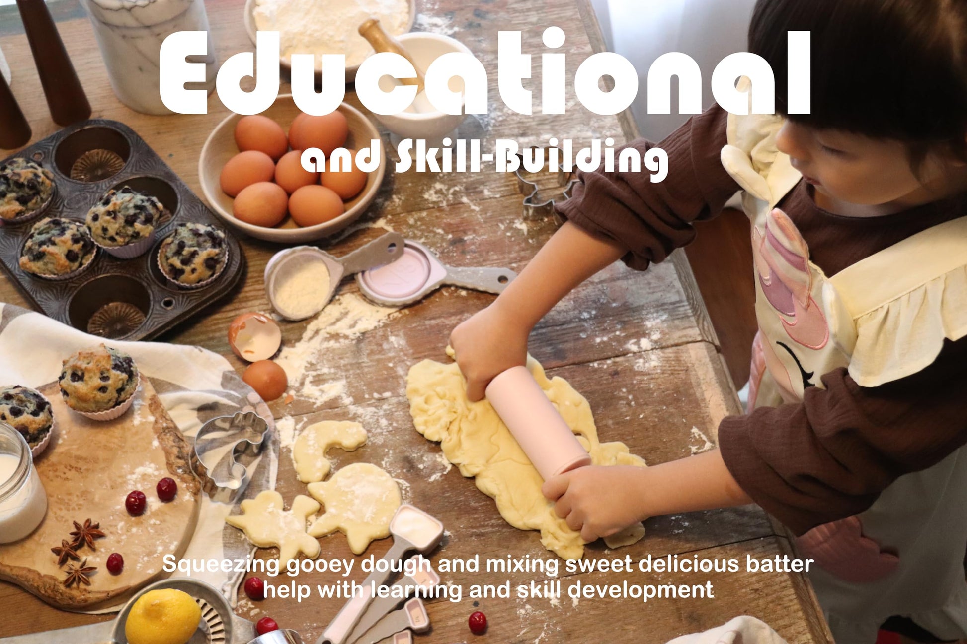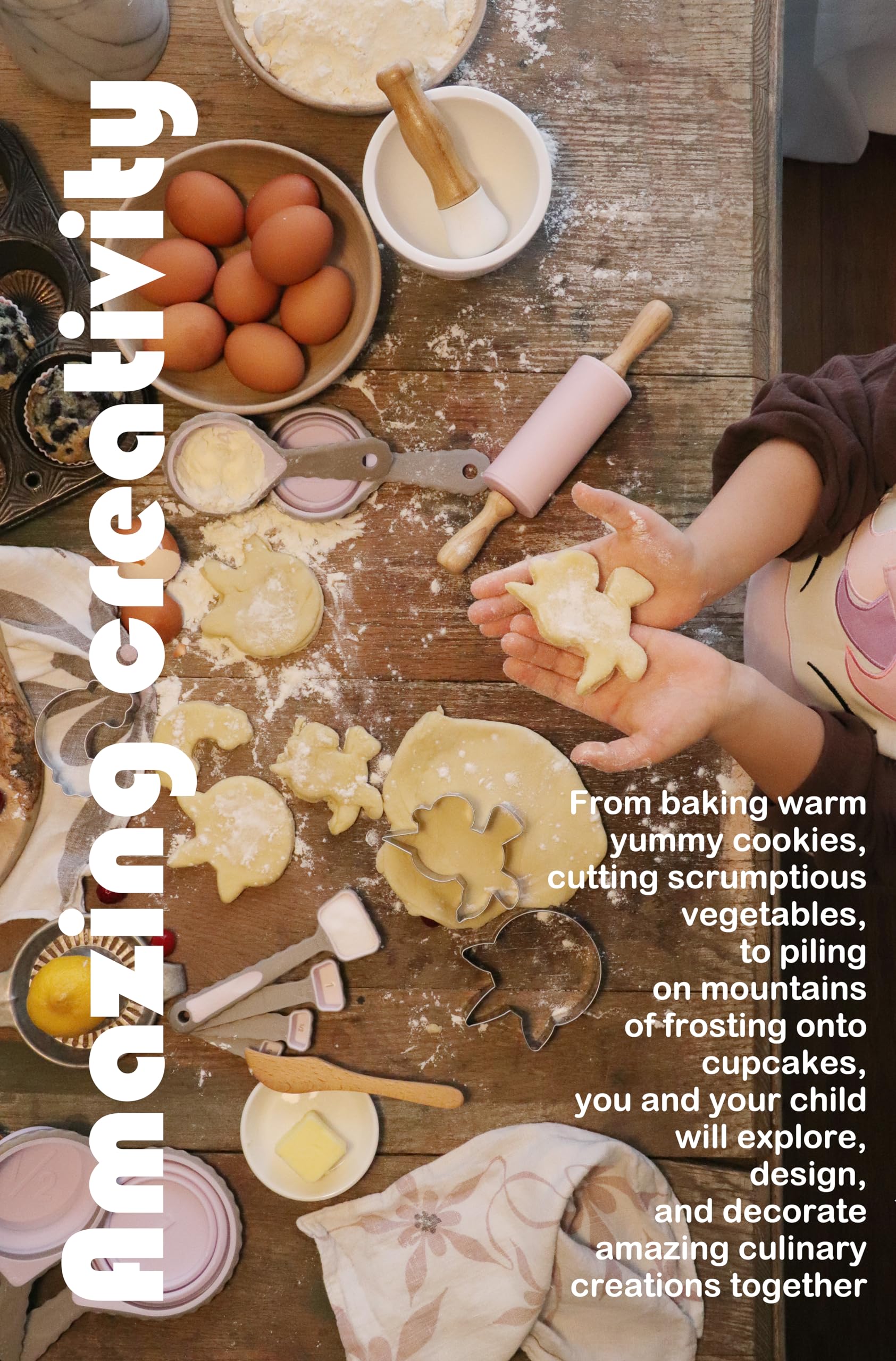 - π§ EDUCATIONAL AND SKILL-BUILDING: Squeezing gooey dough and mixing sweet, delicious batter help with learning and skill development. Therefore, we chose materials excellent for facilitating sensory learning. Included are silicone utensils with wooden handles, stainless-steel cookie cutters, working knives in 3 sizes, and collapsible silicone measuring cups.