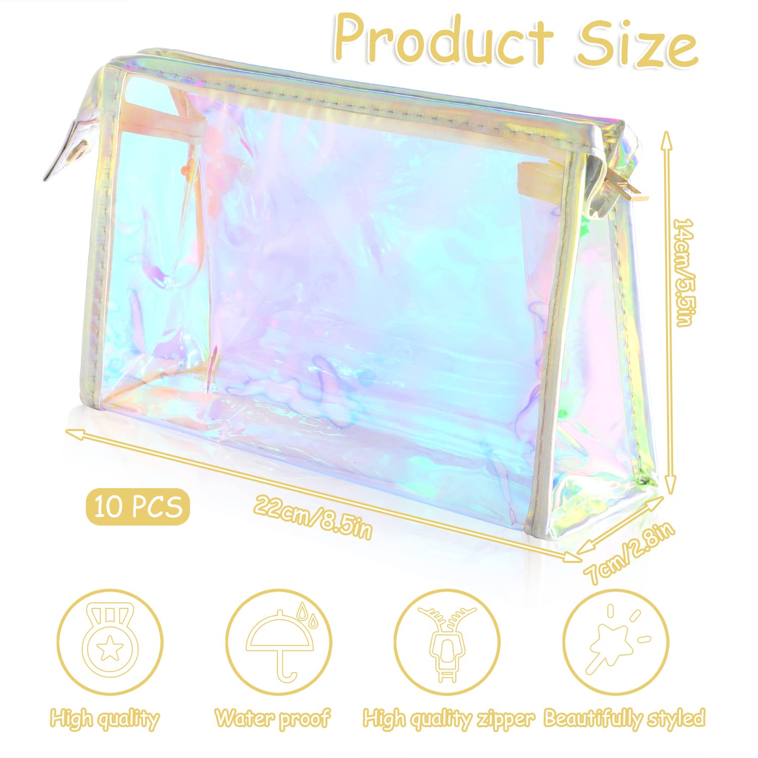 - 【10 Cosmetic Bags】You will get 10 pieces holographic iridescent cosmetic bags (pink edging), simple and stylish, with dimensions of 8.5×5.5×2.8 inches, with enough space to hold all your cosmetics.