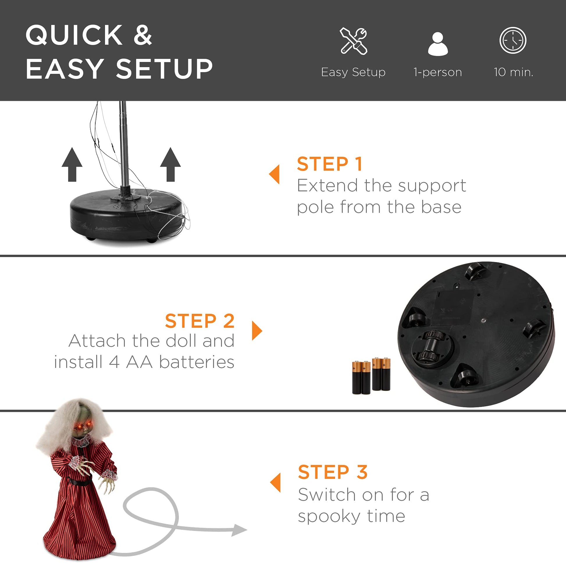 - SOUND AND TOUCH ACTIVATED: Scream, clap, or touch to surprise guests while manual activation lets you spread fear with the press of a button