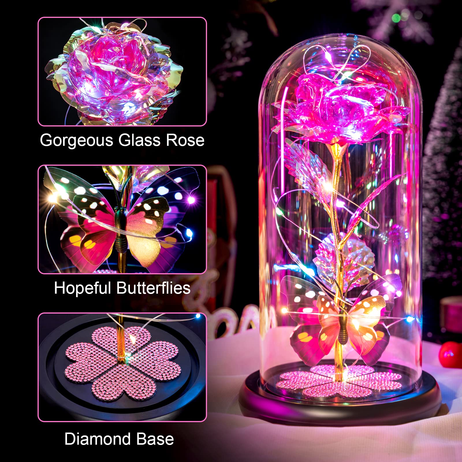 - Warm Galaxy Rose Birthday Gift for Women: Pink Forever Roses Flower Gifts: Will never wither away, symbolize everlasting love; and the butterfly symbolizes hope and good wishes; The Heart-shaped crystal pasted on base, a symbol of toughness and eternity; while illuminated by the string of lights more luxurious, exquisite and full of artistic sense. It is a unique artwork, Very suitable as Christmas Gifts, Anniversary Gifts, or birthday gifts for your mom, wife, grandma, daughter, sister