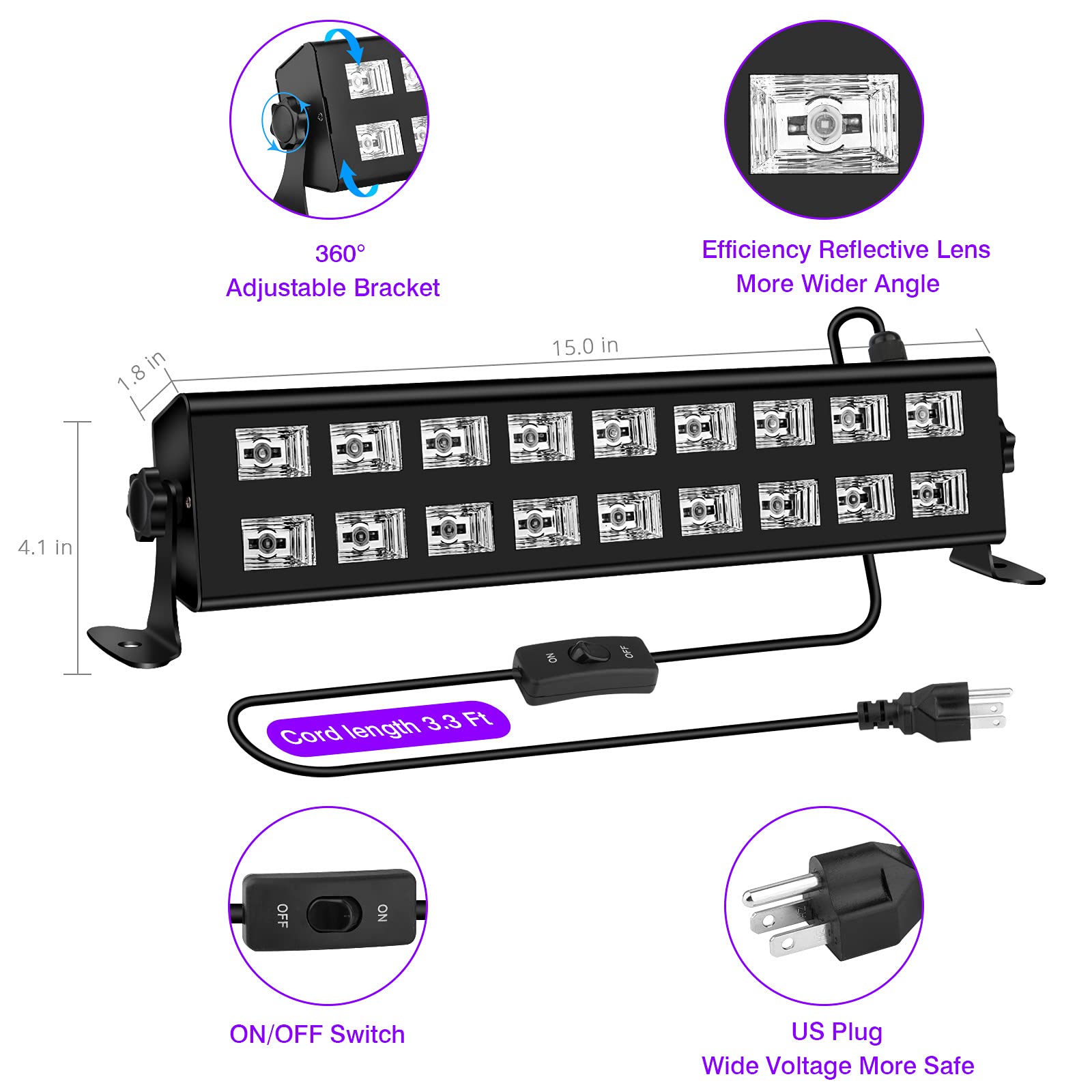 - SAFE WAVELENGTH TO USE: Our 18LEDs black light is brighter and the effective working range (lighting distance) is larger, and this is a pretty safe long wave black lights bar, safe to your eye, skin, and body, safer than 365nm and 385-390nm black lights.