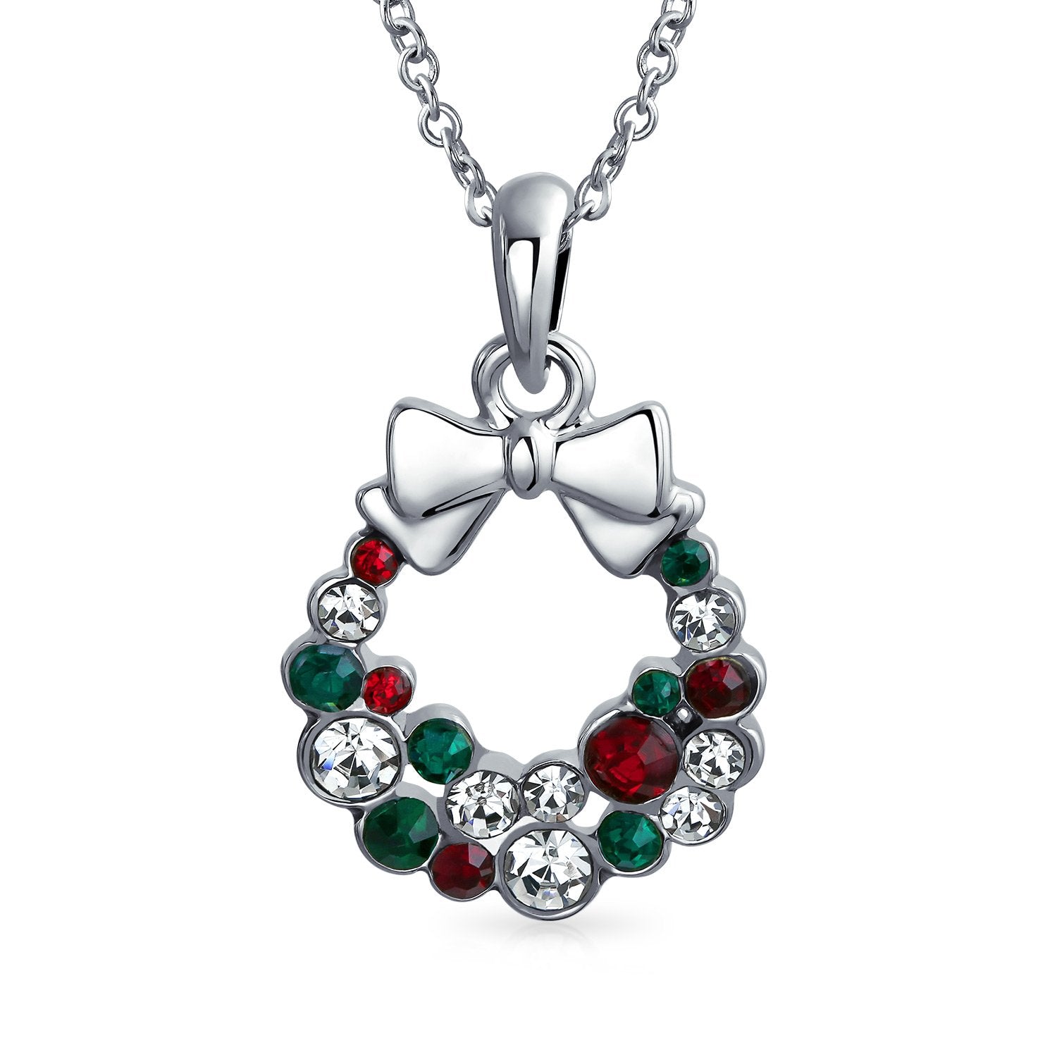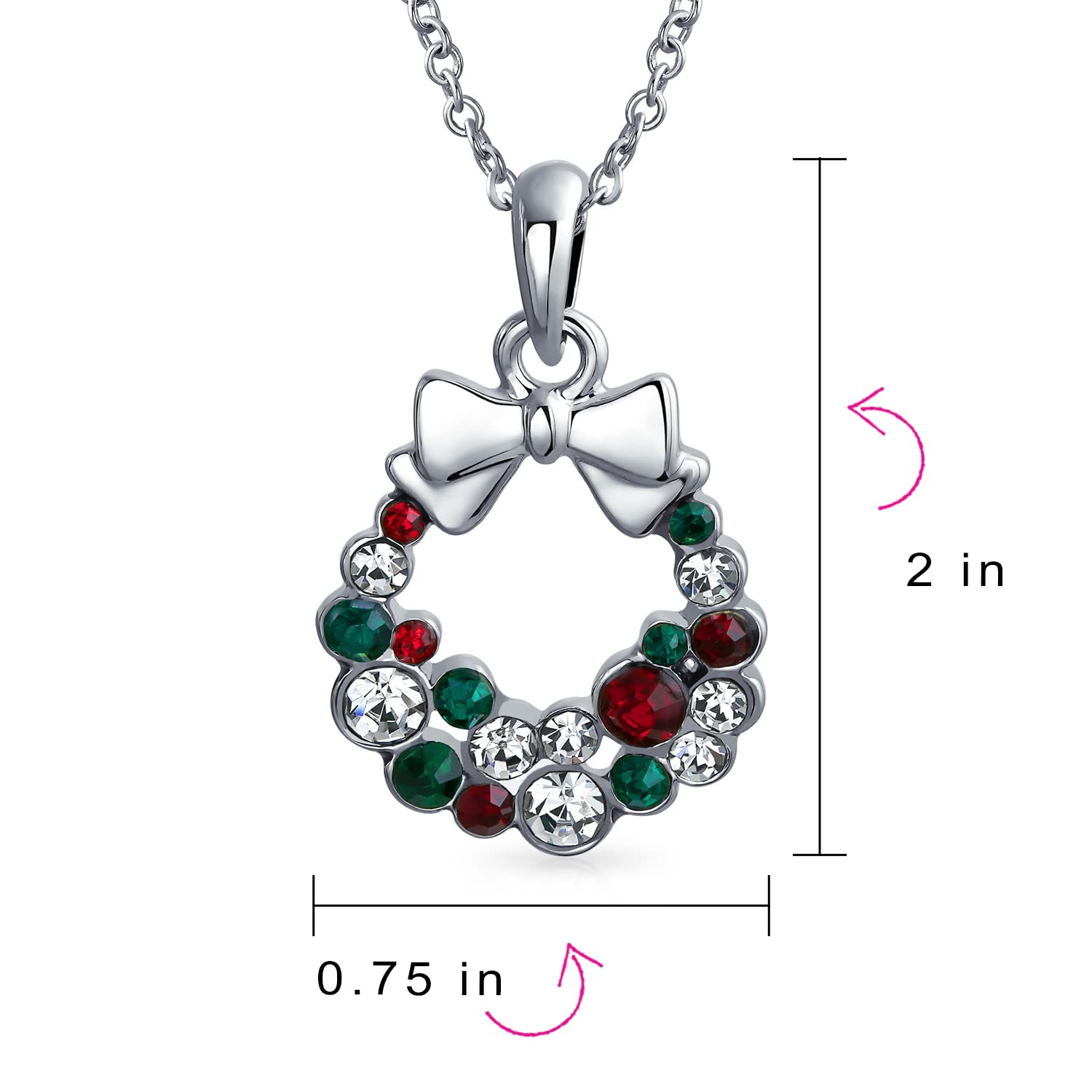 Bling Jewelry Fashion Sparkling Christmas Bow Red Green White Crystal Holiday Wreath Pendant Necklace For Women Teen Crystal Silver Plated
