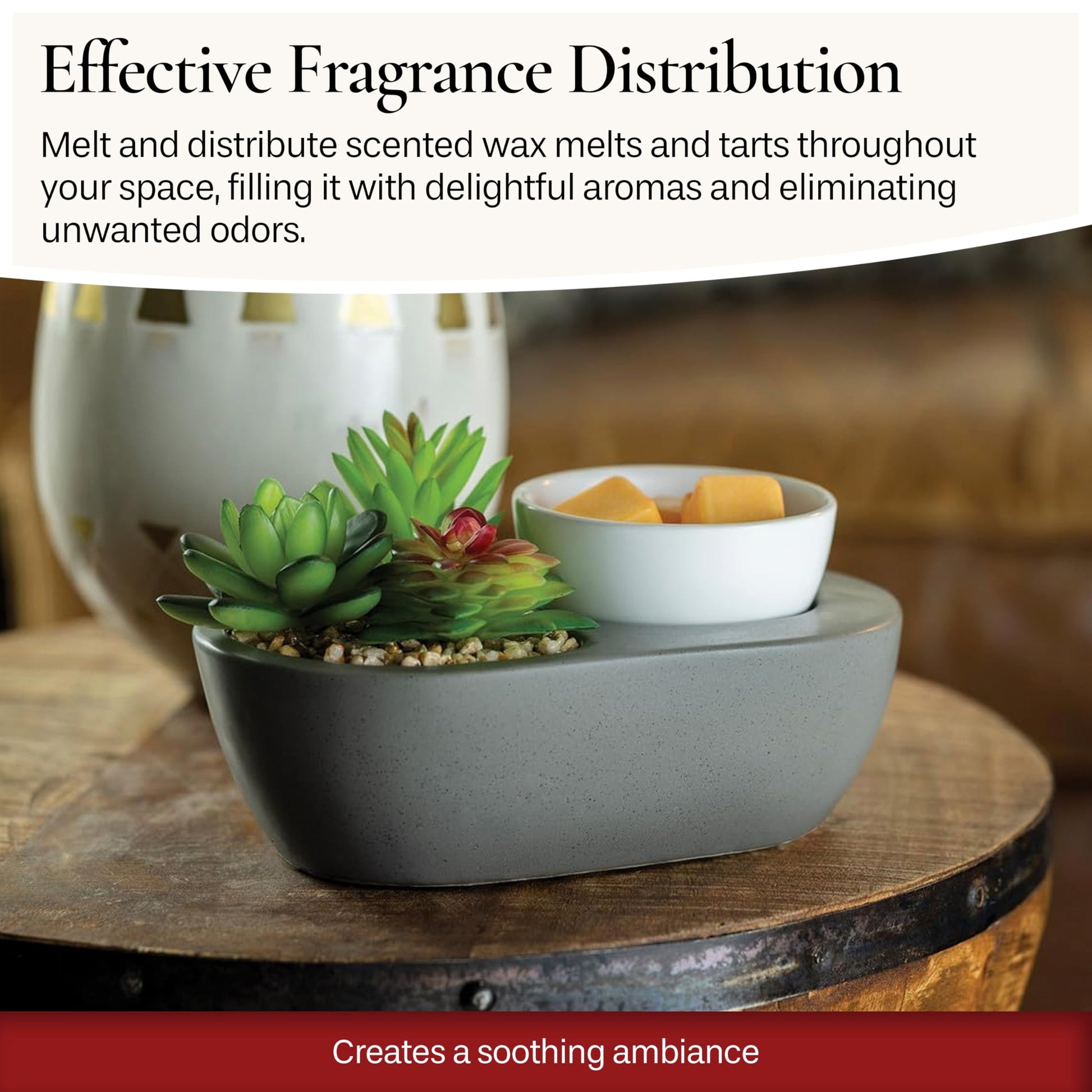 - ELEVATE YOUR HOME DECOR – The combination of a sleek satin-finished grey base, a serene succulent garden, and a modern white warming dish adds a touch of trend-forward elegance to any space. Perfect for enhancing both the style and fragrance of your room.