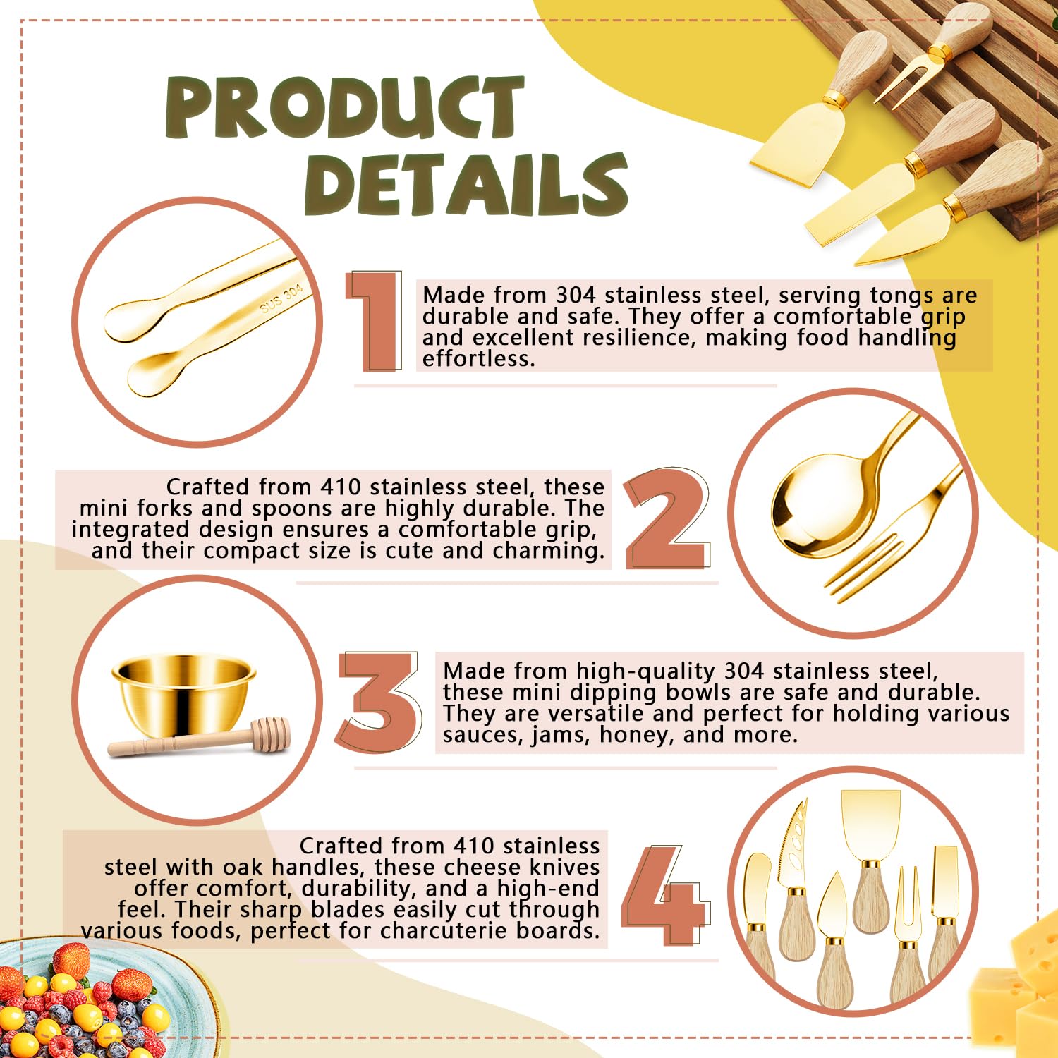 - 【Premium Materials and Advanced Technology】The dipping bowls, serving tongs, fork and spoon are crafted from high-quality stainless steel with advanced integrated technology. The cheese knives and spreaders have stainless steel blades and oak wood handles, making them durable, wear-resistant and corrosion-resistant. Their mirror-polished surfaces are smooth, bright and easy to clean. Everyone will love them, they are your best choice.