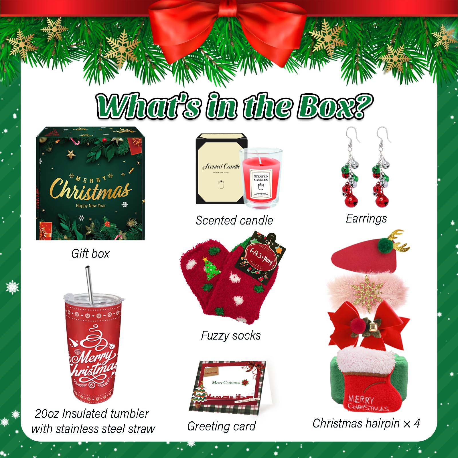 - SPECIAL LOVE FOR SPECIAL PEOPLE: Christmas gifts for women contains a pair of plush Christmas socks, soft material can not only make her feel warm in the cold winter, but also as a holiday decoration. We also prepared hair clips in the shape of snowflakes, bows, socks and bell earrings, adding a thick festive atmosphere, whether it is daily wear or holiday parties, she can be the focus of attention.