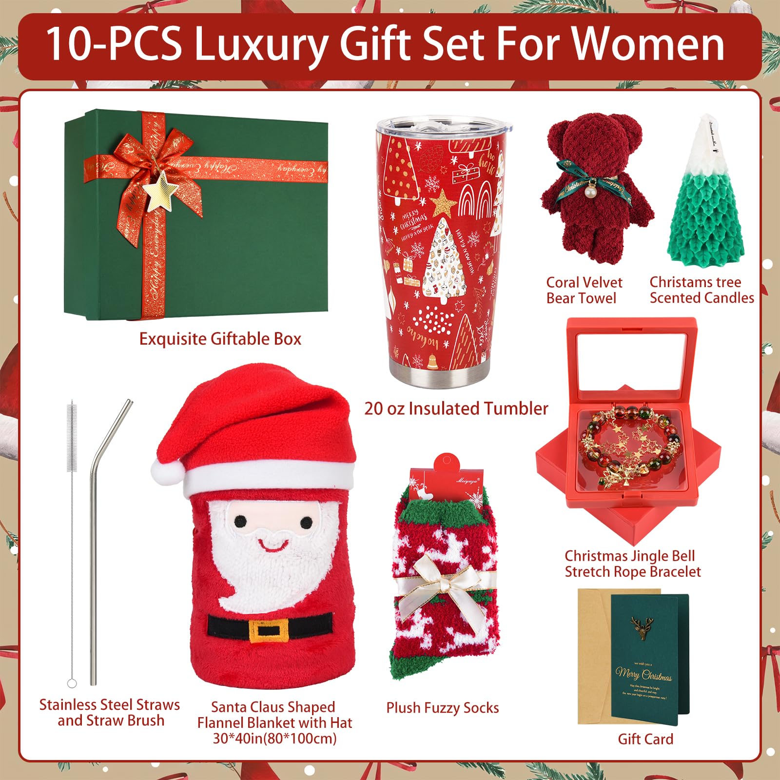 Details: 1.Unique Christmas Gift Set: Carefully designed Christmas box includes: 1*20 oz insulated tumbler( with straw and brush), 1*Santa Claus-shaped flannel blanket with hat 30*40in (80*100cm), 1*Super beautiful Christmas Jingle bell stretch rope bracelet with box, 1*Coral velvet bear towel, 1*Elk horn gift card,1*Christmas tree scented candle, 1*Plush Christmas fuzzy socks, 1*Exquisite gift-able box. This Christmas gift box set will be the most mysterious surprise for her, bringing sweet surprises and warming her heart on this special day.  2.Perfect Christmas Gift for Women: Wondering what Christmas gift to get for the ladies? Our meticulously designed Christmas gift box set is the perfect answer. Present her with an enchanting Christmas ensemble, making her Christmas full of romance. Ideal as a Christmas gift for mothers, grandmothers, wives, best friends, sisters, colleagues, girlfriends, teachers, nurses, or any special lady in your life. Make her feel unique and give her a fun Christmas gift!  3.Creative Santa Claus-shaped portable blanket: 30*40in, 0.2kg is easier to carry and use than other sizes of blankets. The unique button design allows you to easily roll up the blanket and put on a cute Christmas hat. Imagine the surprised expression on her face when she receives a gift and discovers a blanket from a cute Christmas doll. When she uses it as a shawl, cloak, or knee covering, it will always remind her of you.  4.Christmas Charms Bracelets: With its charms featuring a Christmas red and green color scheme, jingle bells, stars, and more, this bracelet is not only colorful and eye-catching but also adds to the joyful atmosphere of Christmas. By wearing this bracelet, she can enhance her Christmas outfit and stand out during the celebrations. The stretch chain design ensures that this Christmas bracelet fits comfortably on your wrist. The exquisite pull-out design bracelet box is also more suitable for gift giving.  5.Christmas Gifts For Everyone: Designed in exquisite Christmas-themed packaging, specifically crafted for the holiday season, ensuring every girl receiving this Christmas gift feels satisfied and happy. No need for repackaging. Once opened, this Christmas gift set will bring her the sweetest surprise, allowing her to feel the warmth of love on this special day. If you're not satisfied with our Christmas gift basket, we'll address it.