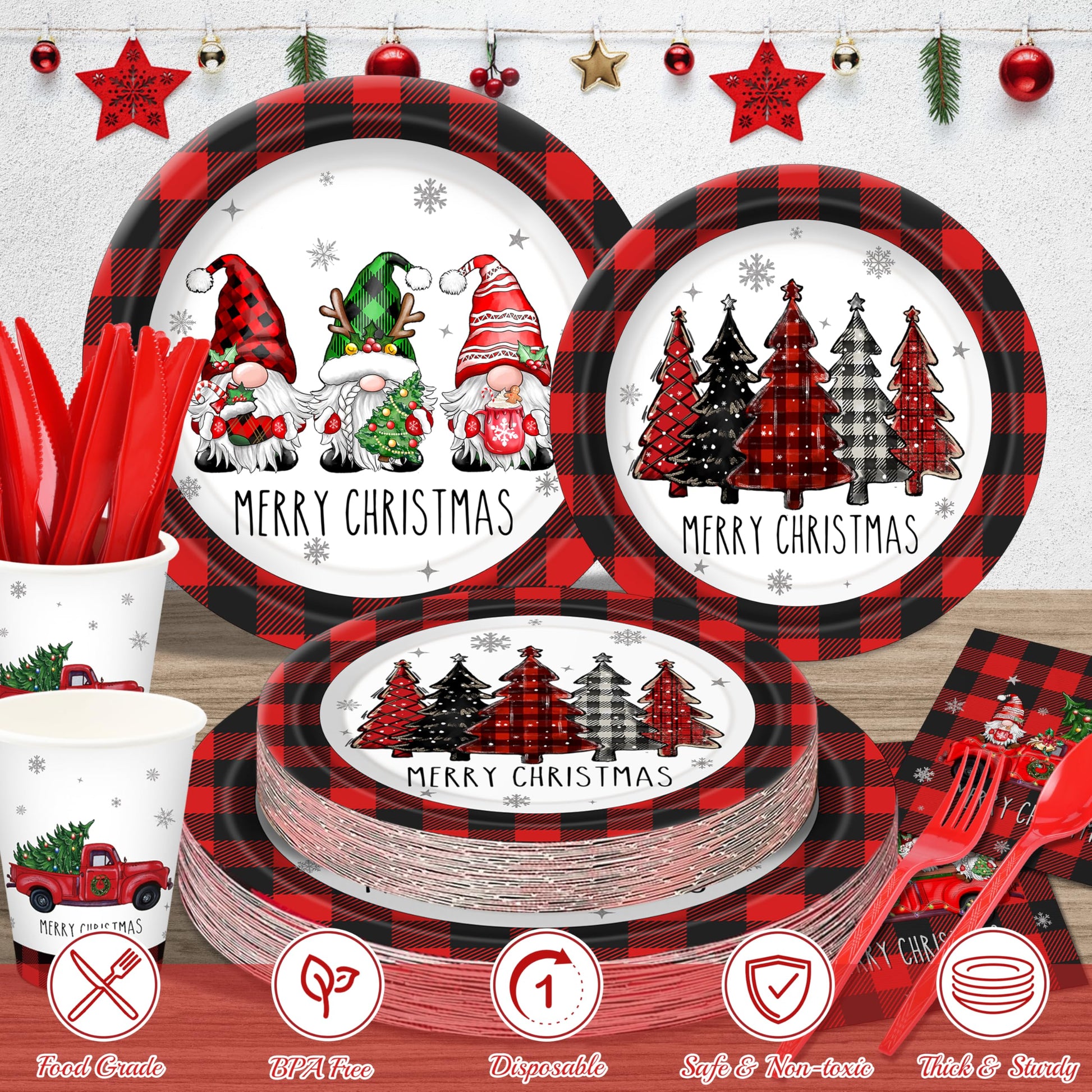 - 🎄Classic Christmas Design: Our Christmas plate set is designed with classic red and black buffalo plaid and Christmas elements such as gnomes, trucks, Christmas trees, snowflakes, etc., very charming and exquisite. All Christmas plates, cups and napkins are printed with the words 'Merry Christmas', and the patterns are vivid, adding a warm Christmas atmosphere, suitable for Christmas parties and holiday gatherings.