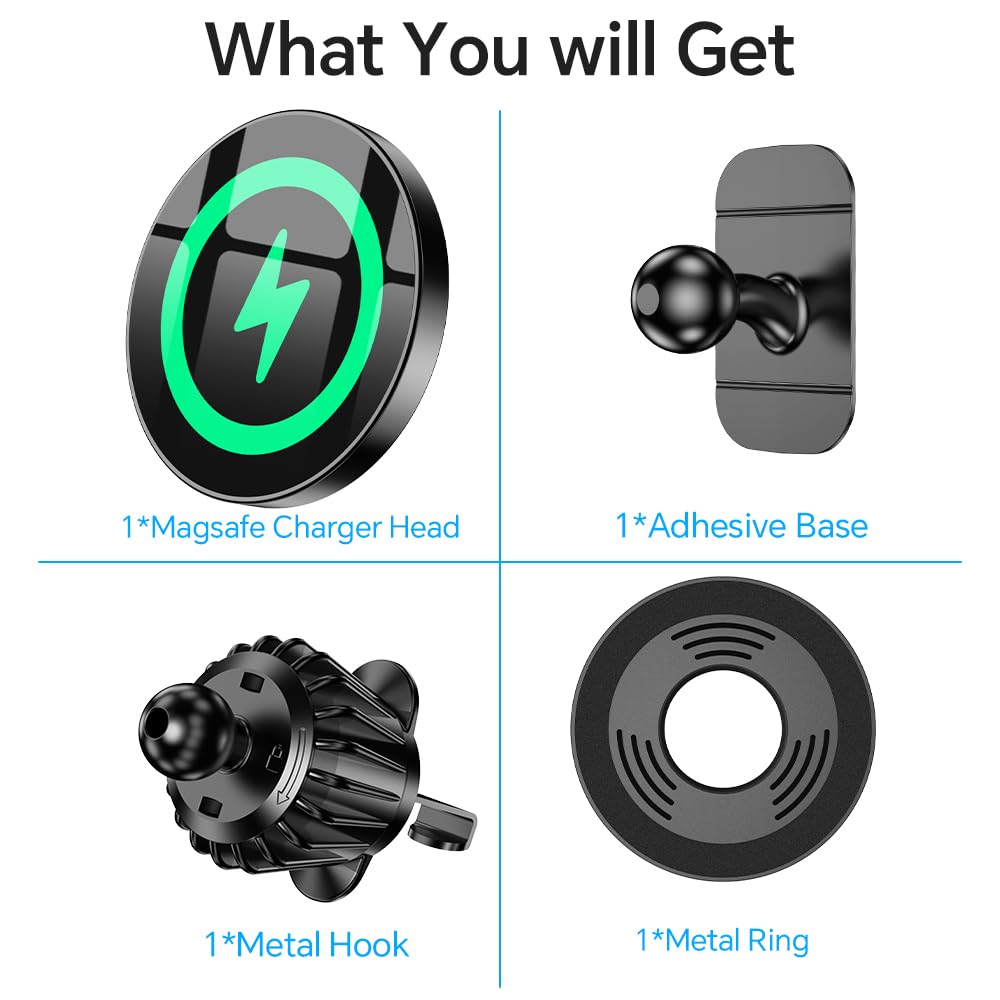 - ✅【2 IN 1 Car Phone Holder Charger】- As the leader of adhesive MagSafe car mounts; The ultra-durable adhesive base design allows our magnetic car charger for iPhone to adhere securely to the dashboard. It stays stable on bumpy roads or during sudden stops. Never Fall Off-Metal Hook Design: adopts simplified locking design, will catch one of car air vent blades and provide excellent strudiness.𝐍𝐨𝐭𝐞: 𝐑𝐨𝐮𝐧𝐝 𝐯𝐞𝐧𝐭𝐬 𝐦𝐚𝐲 𝐧𝐨𝐭 𝐟𝐢𝐭