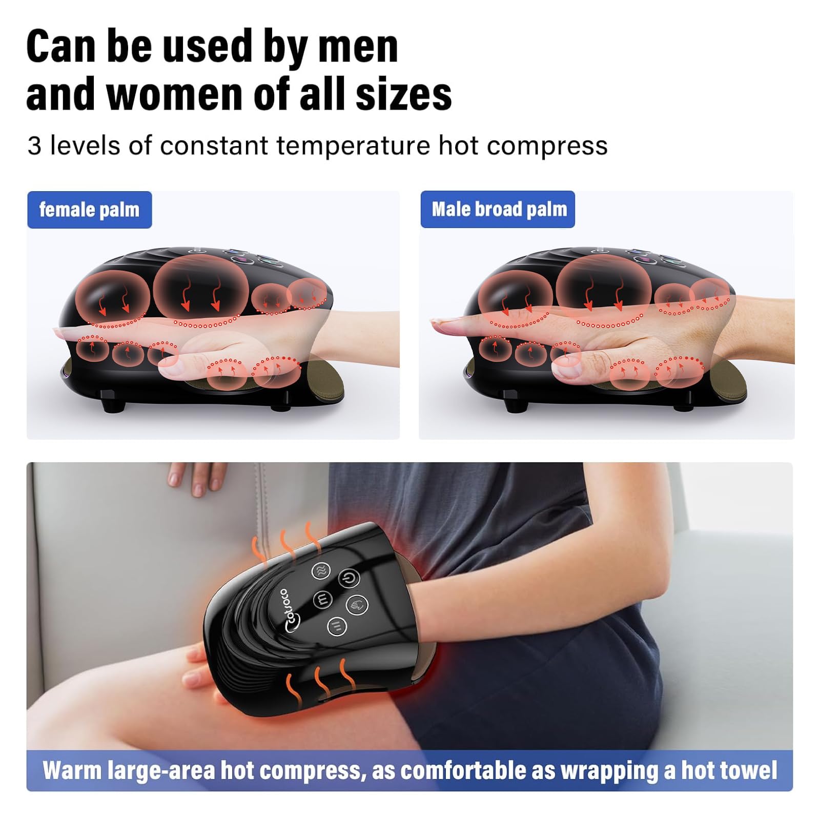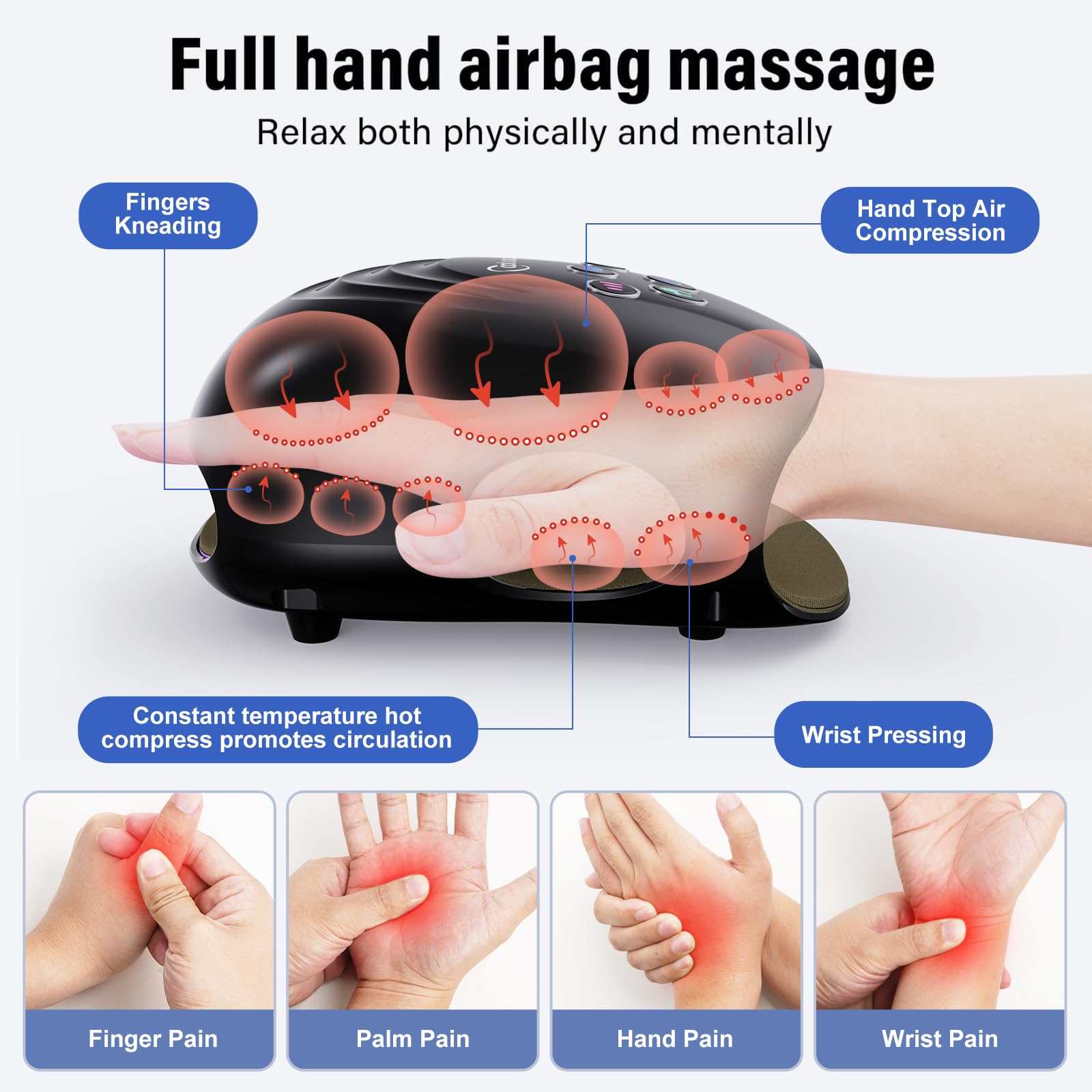 - Innovative Upgrade: The inner cavity of the fuselage is enlarged, the size suitable for the hand can be selected (L/M/S), and double-layer airbags are superimposed to surround the entire hand. 3 heat settings to choose from according to individual needs and preferences. Relax your hands after a long day of work. Heat, air pressure, and kneading help eliminate numbness in your fingers and sore joints. Suitable for both left and right hands.Gifts for Mom.