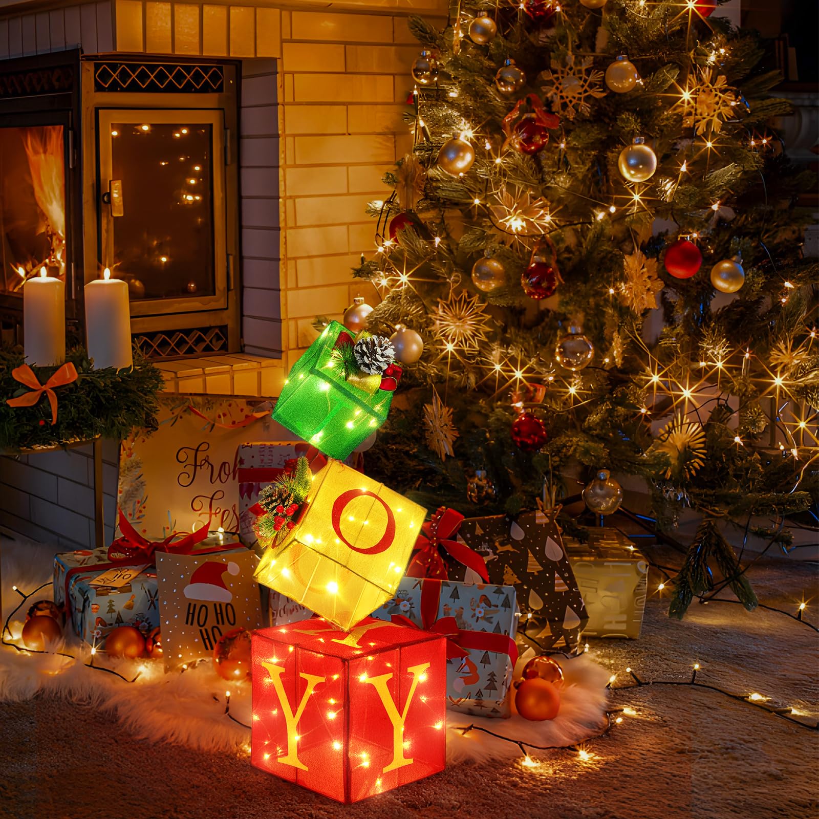 - Versatile Holiday Display: These lighted gift boxes offer 2 arrangement options - display side-by-side or stack up to 2.8ft tall. Perfect for tabletops, mantels & parties, they bring festive cheer with warm glowing lights. Set of 4 beautifully decorated boxes for stunning holiday decor