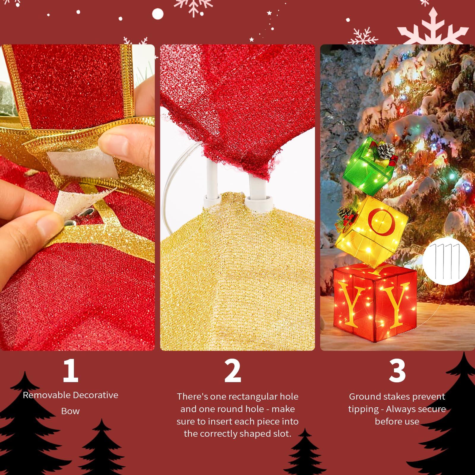 - Easy to Assemble: The lighted gift boxes can be stacked up to 2.8Ft tall. Each box has a hidden round hole and rectangular slot—just match the shapes to stack them securely. (Note: The slots are discreetly designed, so check carefully!)