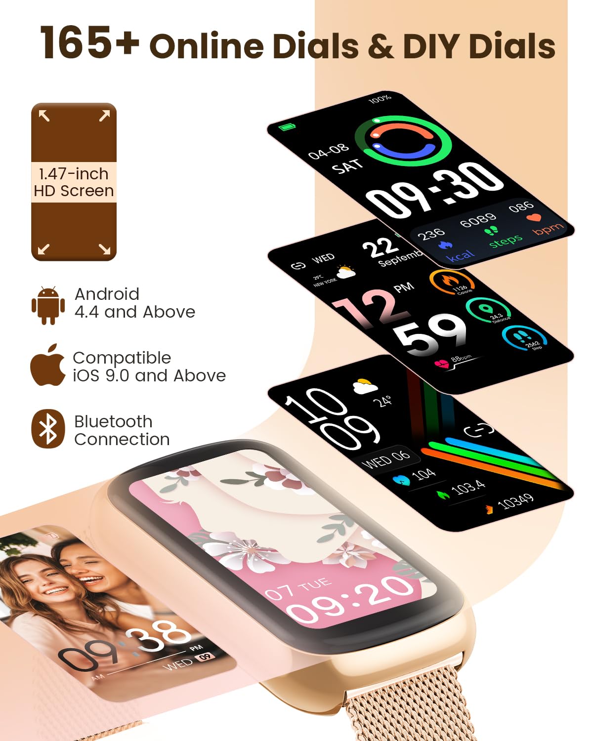 - [2 Watch Bands, 165+ Watch Faces] The sporty silicone band and the exquisite metal band can match any clothes in your wardrobe, making you very charming no matter what occasion. 165+ watch faces are available for you to choose, and you can also customize your unique dial with your favorite photos. The combination of 14.5g ultra-light body and 1.47-inch high-definition screen brings the ultimate user experience to people who wear this fitness watch.