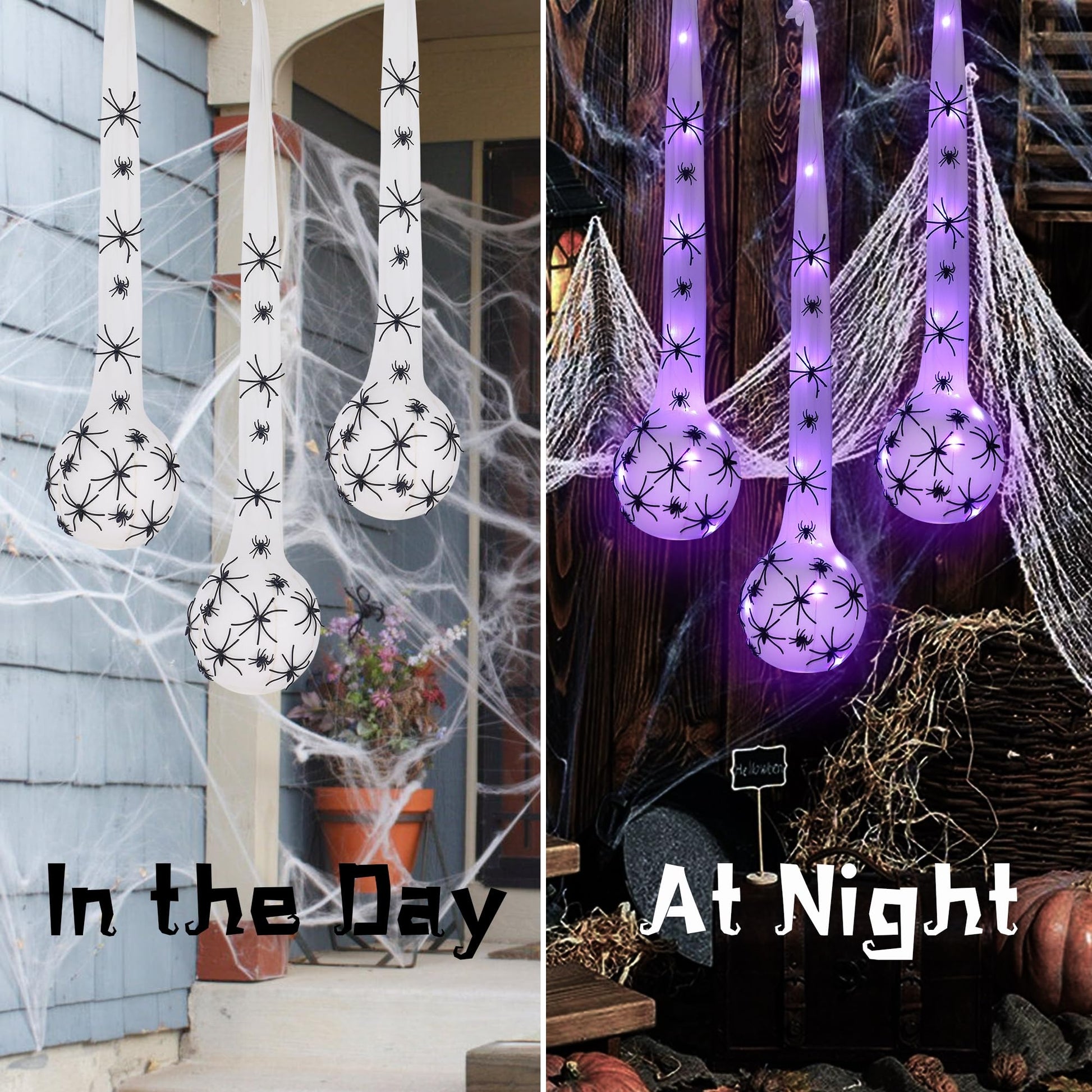 - Package Contents: The package of spider sack decoration includes three 2-foot-long purple LED-lit hanging spider egg bags with spider webs, 57 large spiders, 24 small spiders, and 81 adhesive papers for both indoor and outdoor Halloween decorations. Enjoy easy and fun DIY Halloween decorating with your kids using this comprehensive set.
