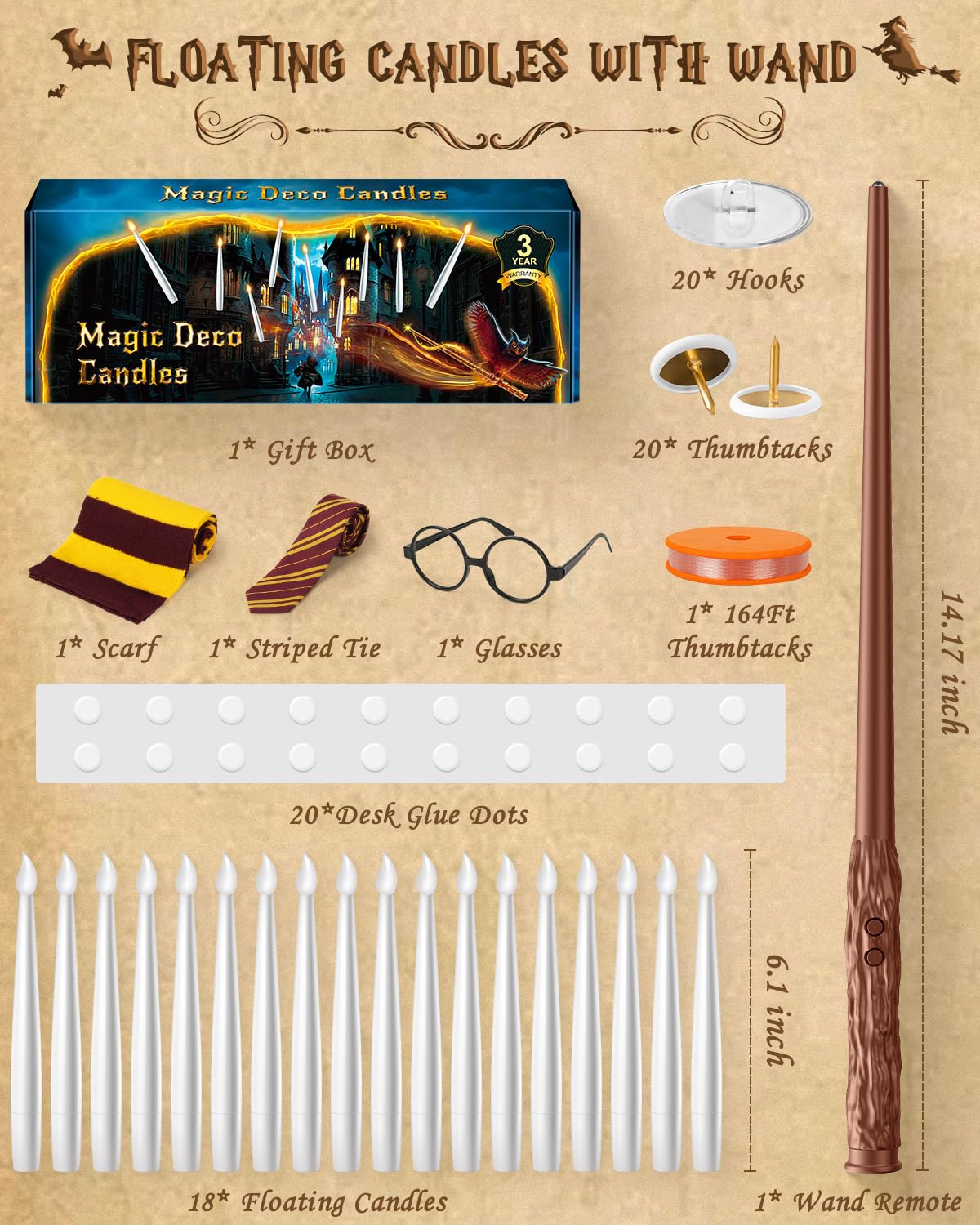 Floating Candles with Wand Remote 18PCS - Magic Hanging Candle with Glasses, Tie, Scarf, Flameless Taper Candles Floating Lights Gifts for Halloween Decorations Christmas Wedding Birthday Party Decor