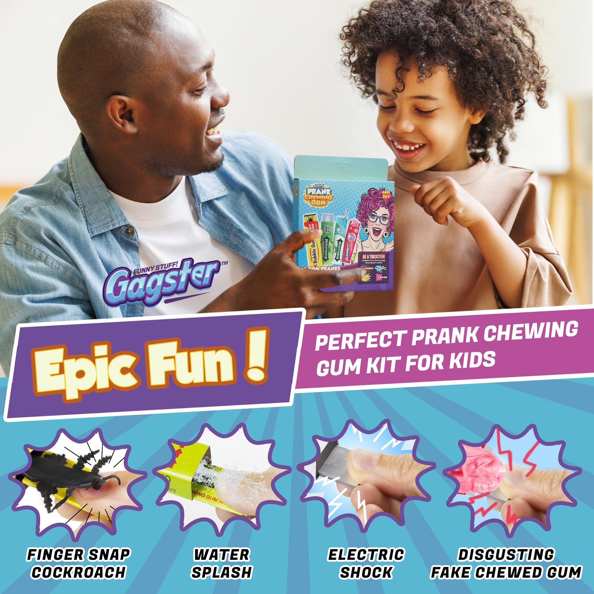 Gagster 4-in-1 Prank Chewing Gum Set – Shocking, Water Squirt, Cockroach Snapping, Fake Chewed Gum, Gag Gifts for Kids Adults, Work Pranks, April Fools, Practical Joke Toys Kit