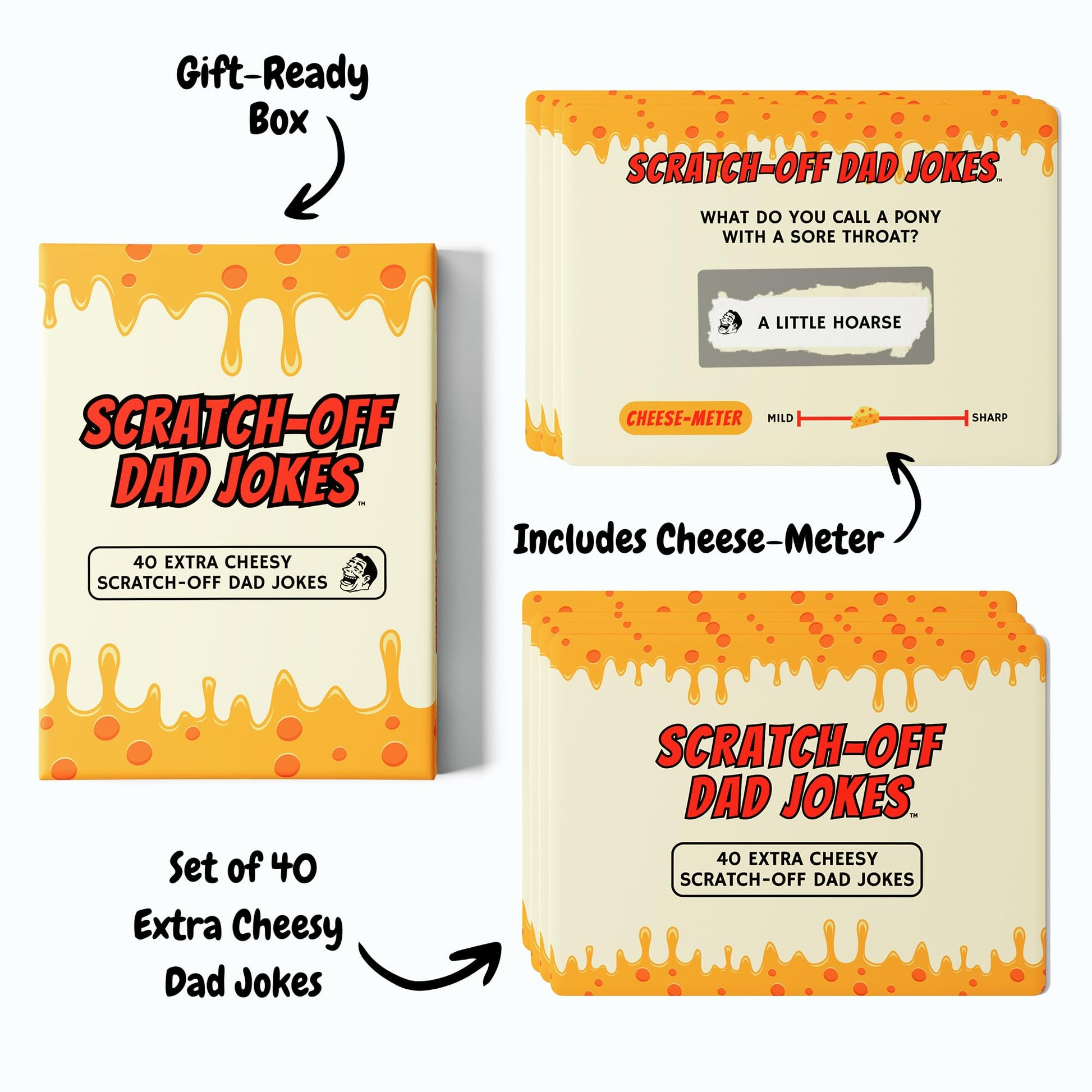 - SCRATCH OFF DAD JOKES - This set includes 40 extra cheesy and hilarious dad jokes. Each joke was hand selected for maximum dad joke humor. Simply select a card at random, read out the dad joke and then scratch-off the hilarious punchline. All jokes are family friendly, extra cheesy and bound to put a smile on dad's face.