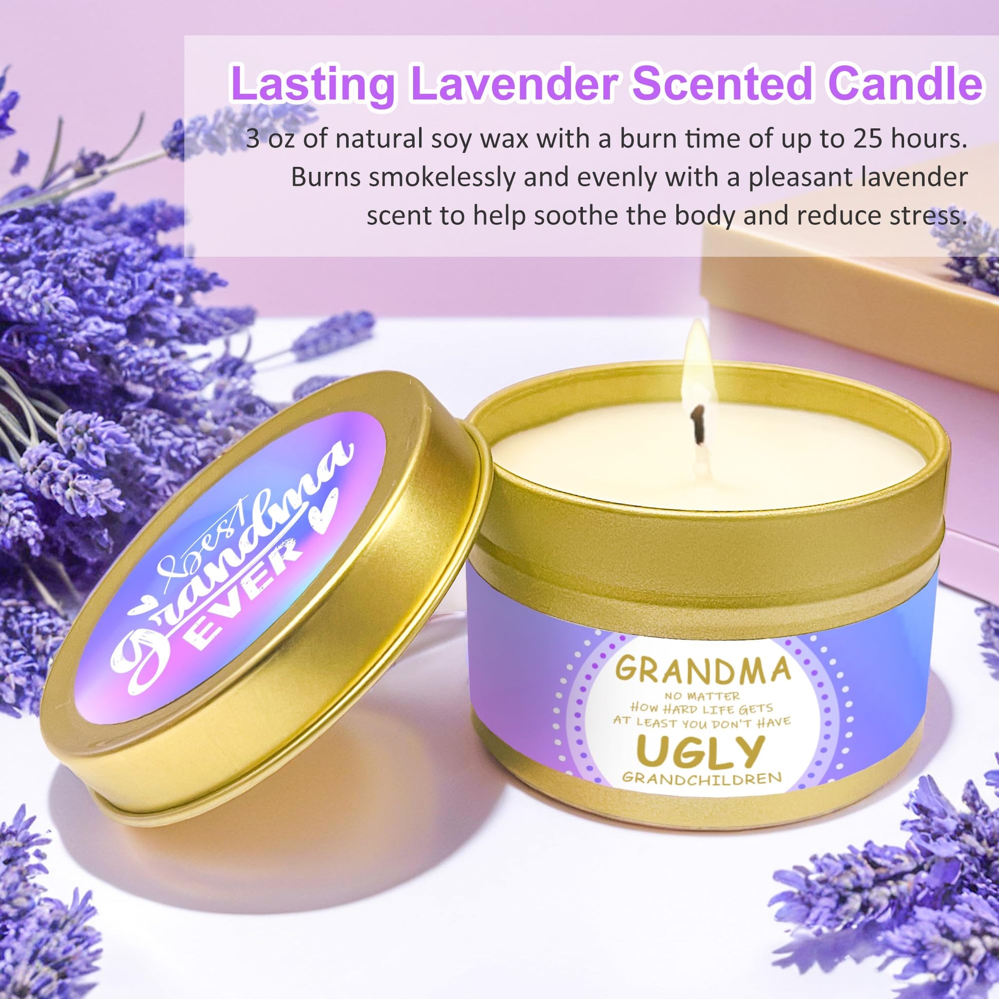 - [Grandparents Day Gifts for Grandma] Purple Gift Box, Presenting a Lavender Themed Women's Gift Basket that will impress her at first glance; our gift promises an unforgettable out-of-the-box experience, the perfect way to express caring&love, and the ideal gift for all the amazing women in your life. Each gift box contains: 20oz insulated stainless steel tumbler x1, one pair of plush socks, soy wax lavender scented candle x1, natural stone bracelet x1, and gift card to write your special message