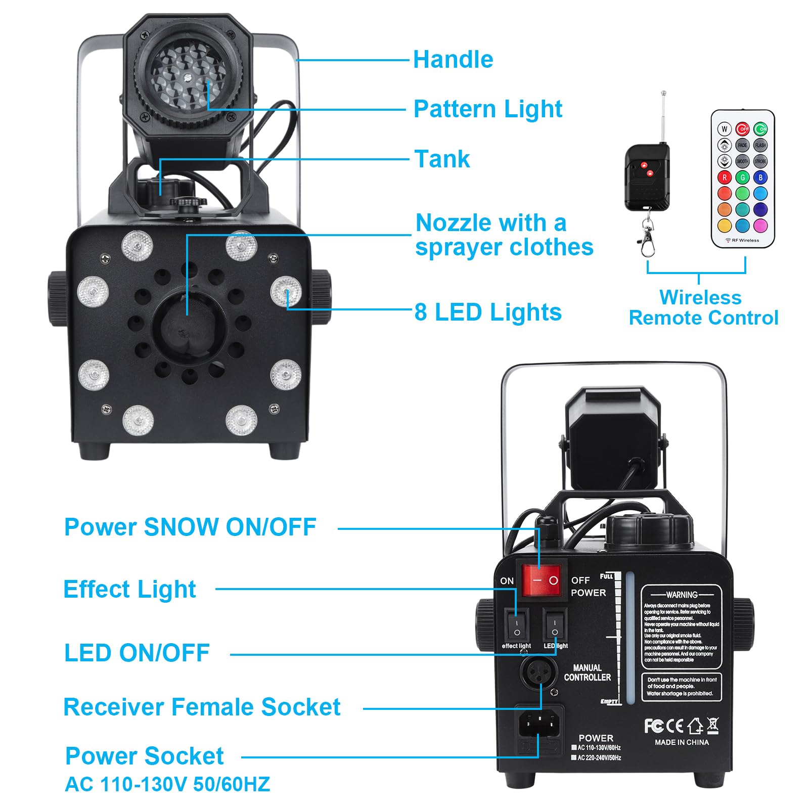 - Dual Wireless Remotes: The snow machine comes with two wireless remotes. One is for controlling the snow spray, freeing you from the need to stay beside the machine. The other is for the LED lights, allowing you to switch colors effortlessly from a distance.