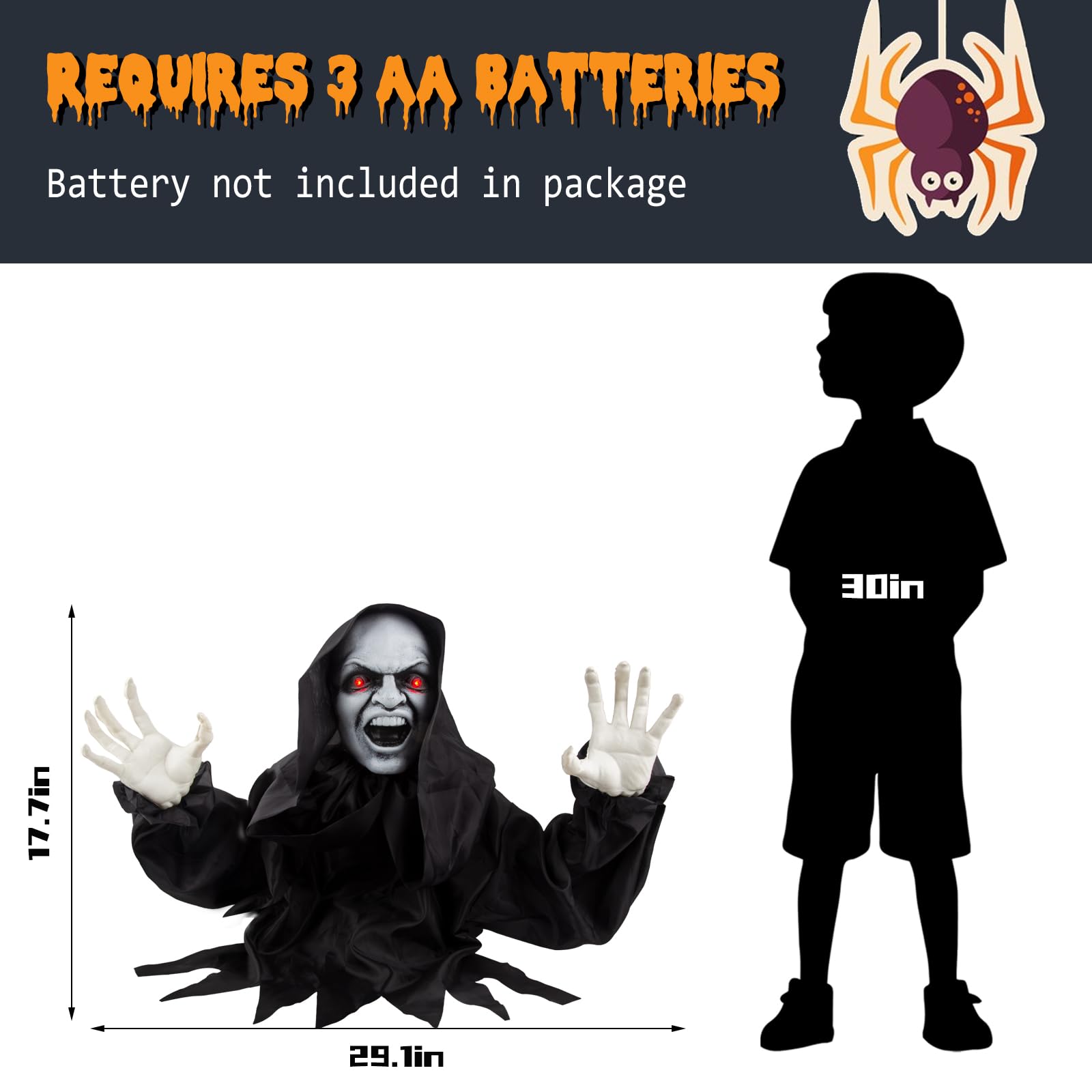 Details: Halloween Animatronics Decorations - Scary Grim Reaper with Sound Activated, Creepy Sound, Light Up Eyes, Scary Motion for Halloween Indoor/Outdoor Yard Lawn Decoration, Haunted House Props
