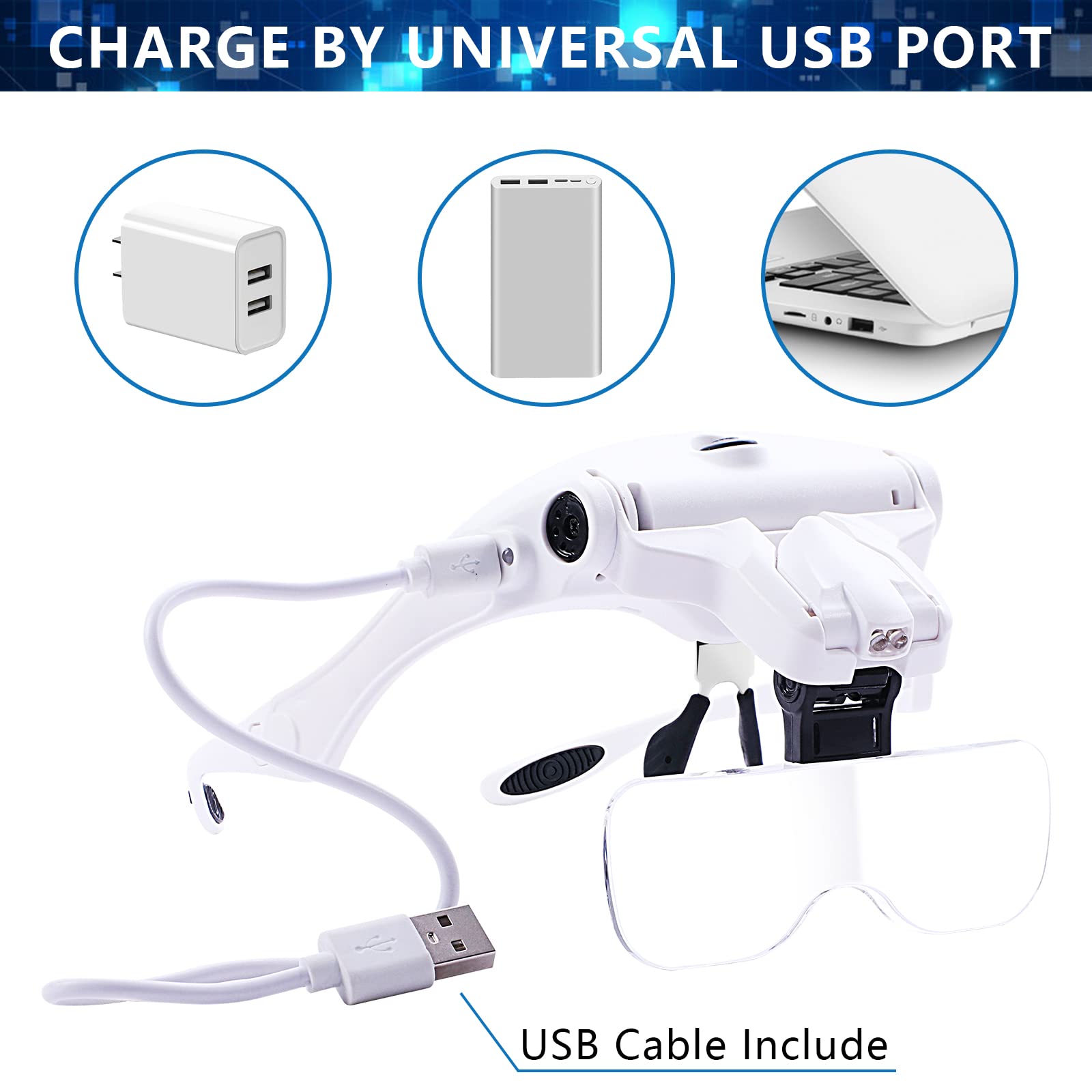 Hands Free Headband Magnifying Glass, USB Charging Head Magnifier with LED Light Jewelry Craft Watch Hobby 5 Lenses 1.0X 1.5X 2.0X 2.5X 3.5X (Upgraded Version)
