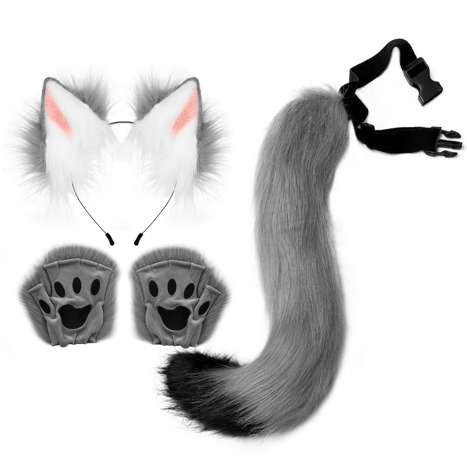 HAOAN Faux Fur Wolf Ears Headband Fox Tail and Paw Gloves Set Cosplay Halloween Costume Accessories