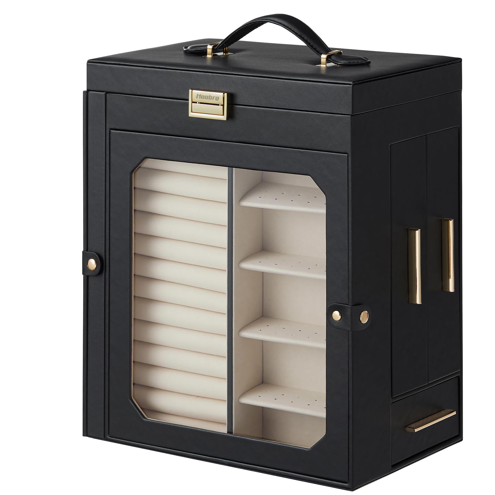 HOOBRO Jewelry Box with Mirror, Travel Jewelry Organizer with Glass Window, Vertical Storage, Christmas Gift, Gift for Loved Ones, for Earrings, Rings, Necklaces, Bracelets, Black BK03JB04G2
