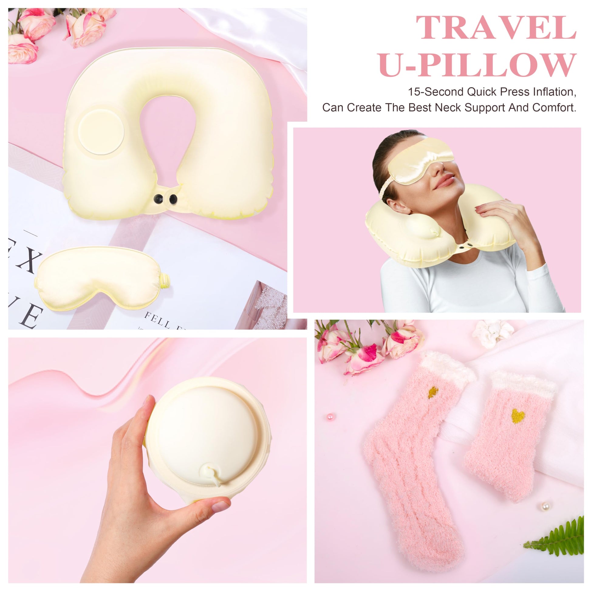 - Make her travels more comfortable with the ultralight inflatable travel pillow in this gift basket. This neck pillow provides superior support to reduce strain on the neck and shoulders, ensuring comfort wherever she goes. Made with a built-in air pump, this pillow is easy to inflate and adjust for the perfect support. Also included is a luxury plush flannel blanket for warmth and coziness during her journey.