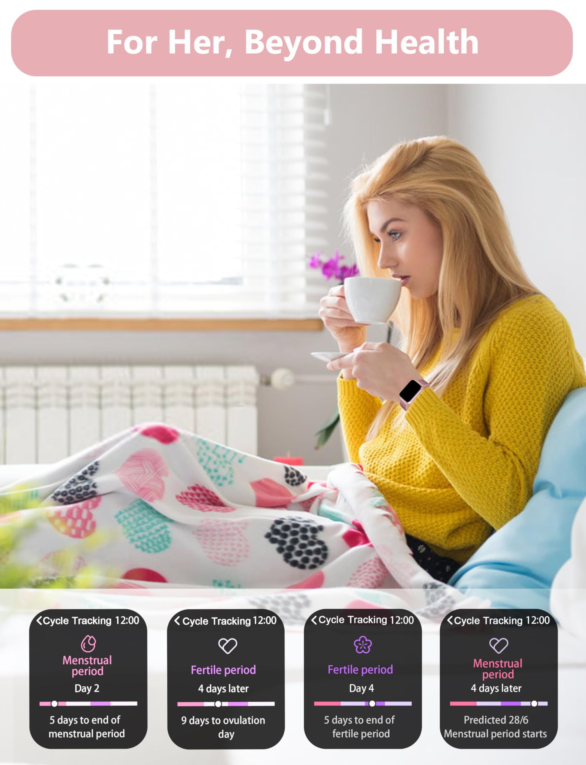 - Health Partner Smartwatch: The fitness smartwatch monitors blood oxygen, stress, and 24/7 heart rate. It also tracks your sleep and breathing quality in real time, keeping you informed of your basic health status. This stylish metal pink watch not only exudes elegance but also features a dedicated menstrual cycle reminder designed specially for women, offering care down to the smallest detail. Whether for everyday wear or special occasions, it's your perfect choice!