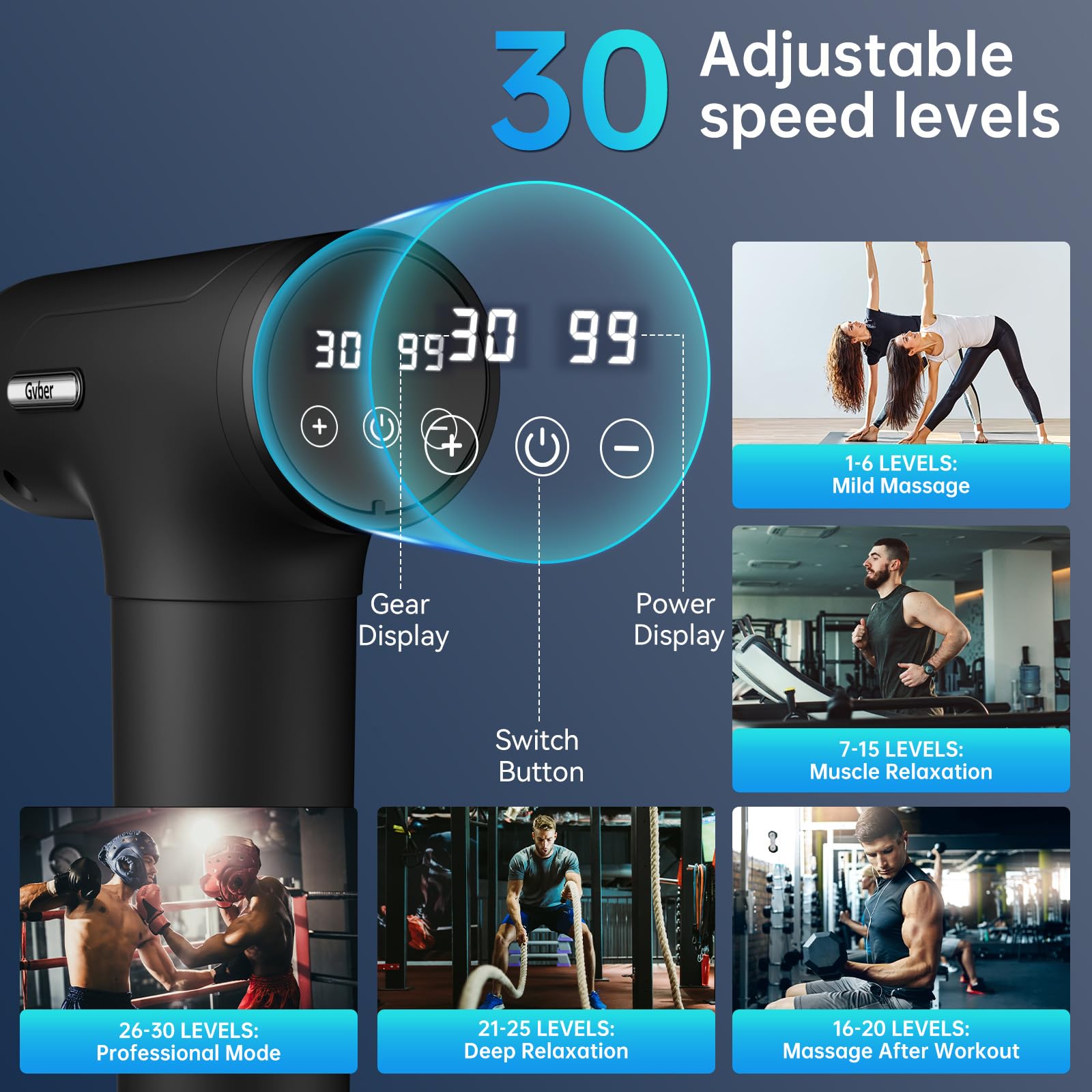 - Relieve Soreness & Back Pain and Stress: 30-speed levels, you can easily customize the intensity of your deep tissue massage gun, ranging from gentle awakening of muscles to a deep, professional-like massage. Including options for deep tissue. Ideal for use in your legs, arms, back, torso and neck shoulder