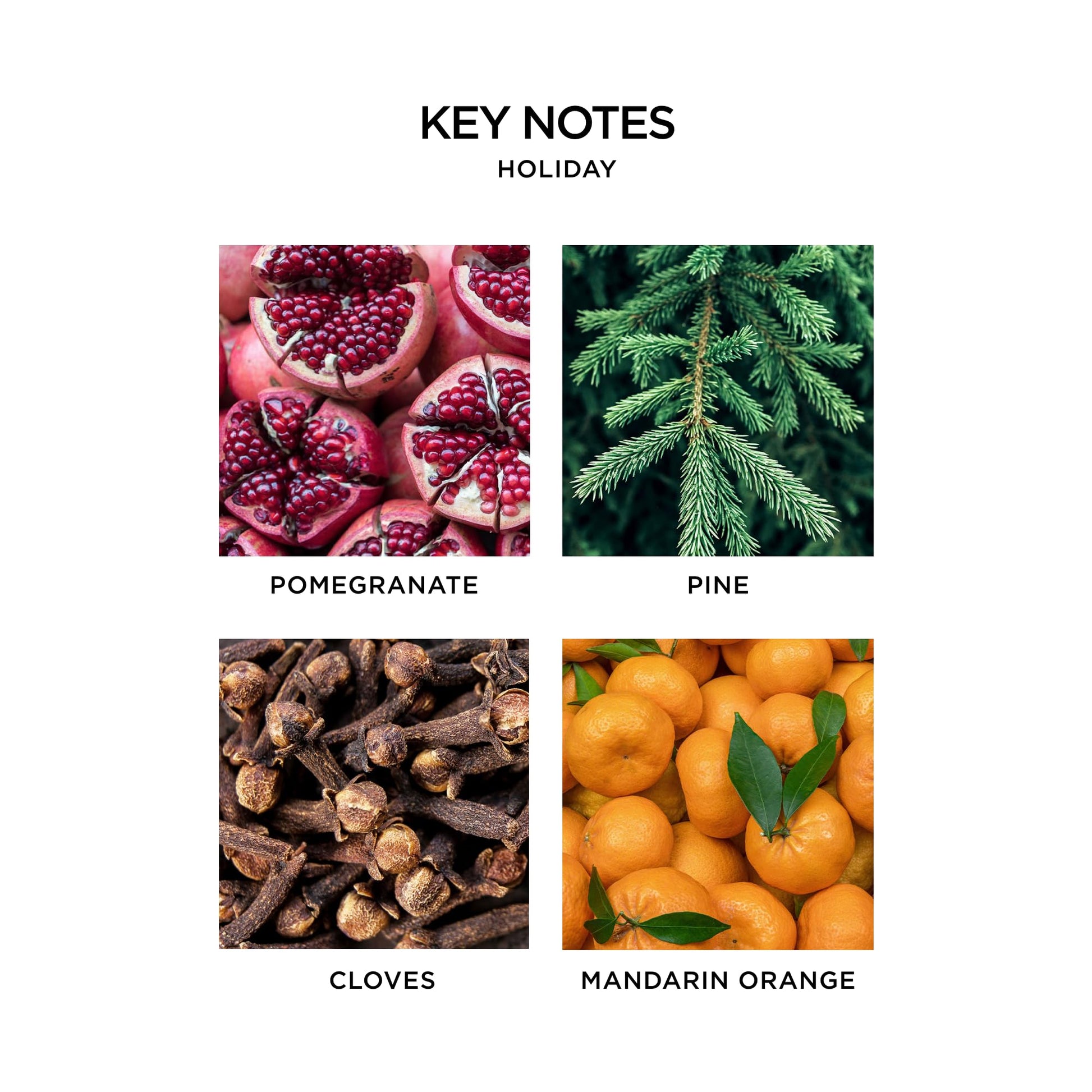 - CITRUS & WOODY - Pomegranate, mandarin orange, pine, cloves, and cinnamon blend with a hint of vanilla and amber in this sophisticated fragrance, instantly providing the aroma of a sparkling holiday season.