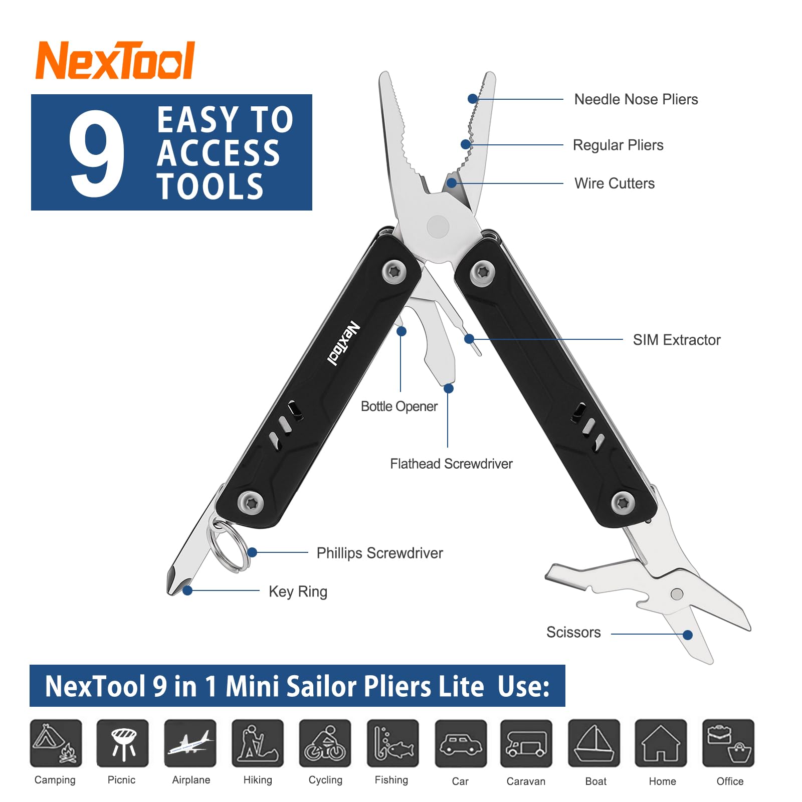 - 9 TOOLS IN 1: This multipurpose keychain multitool packs 9 high-quality tools into one compact unit, including a keyring, needle nose pliers, regular pliers, wire cutters, scissors, bottle opener, SIM extractor, phillips head and flathead screwdrivers, offering versatile functionality in a single device. Whether you are opening a bottle, tightening a loose screw, or take the SIM card out, Mini Sailor Lite is there for you when you need it.