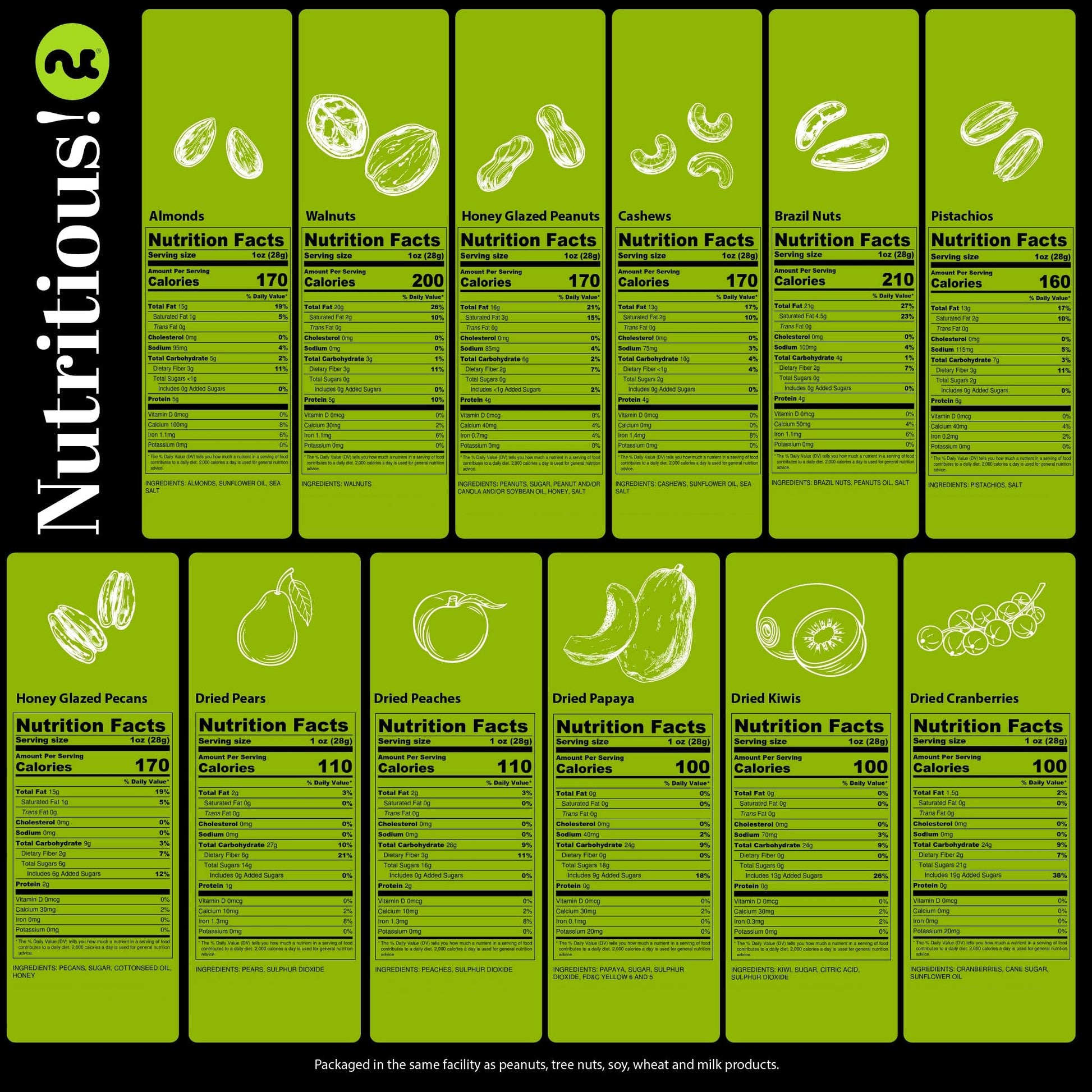 - A SELECTION OF 12 OF OUR BEST NUTS & DRIED FRUITS: Our Black & Gold Snack Tower includes a handful of each of our 12 signature delicious nuts & dried fruits: Almonds, Walnuts, Cashews, Pistachios, Honey Glazed Pecans, Honey Glazed Peanuts, Brazil Nuts, Dried Cranberries, Dried Kiwis, Dried Papaya, Dried Pears, and Dried Peaches.
