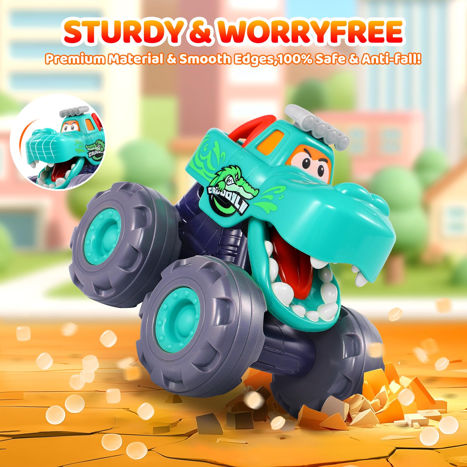 - WORRYFREE PLAYING TIME: Premium toy cars for 1 2 3 year old, made of thicken ABS plastic, non-toxic, BPA free, sturdy, timeproof. Polished round smooth edges, no small sharp parts, well made and not hurt hands. Tested and meets all the safety requirements, outstanding toys for boys, a must have monster trucks for boys toys set for healthy growth of kids!