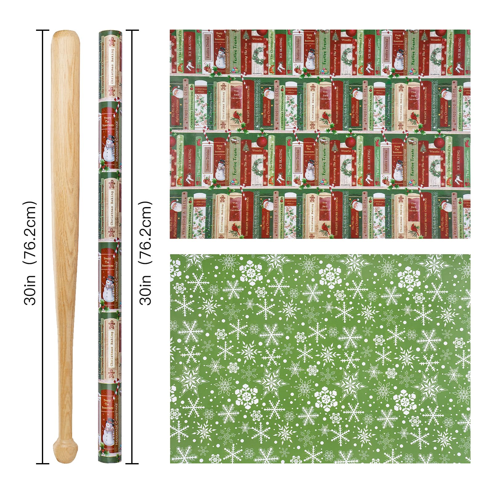 RUSPEPA 30" X 32.8' Reversible Christmas Wrapping Paper Large Paper Roll, Jumbo Roll, Vintage Christmas Bookshelf Design, Green White Snowflake Gift Wrap for Friends, Family, Xmas Holiday Gifts
