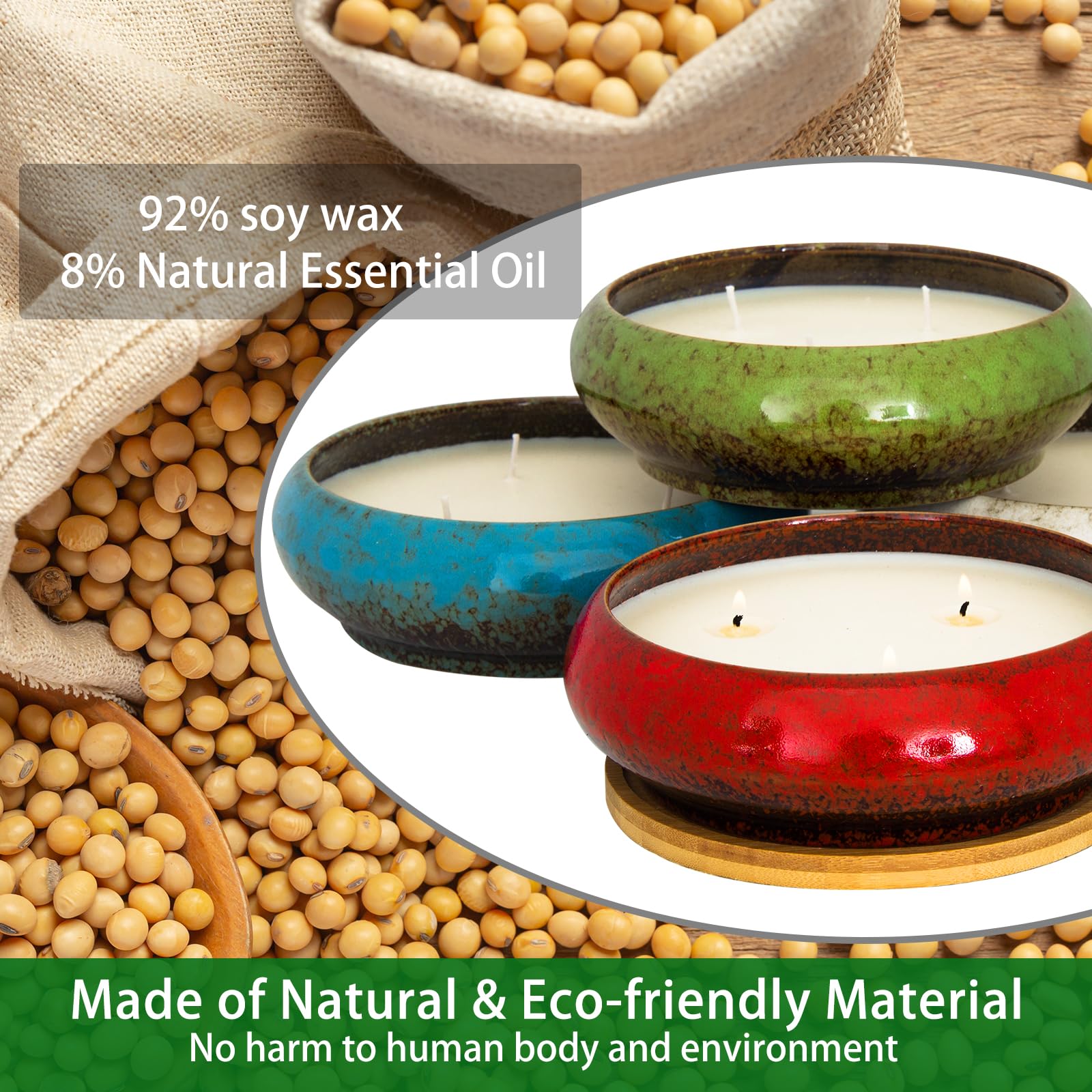 - 【8% Natural Essential Oil & 92% Soy Wax】The lavender candle is made with 92% soy wax, 8% essential oils and 3 cotton wicks. These are safe and environmentally candles for home scented, harmless to the body and evenly burning and produce no black smoke.