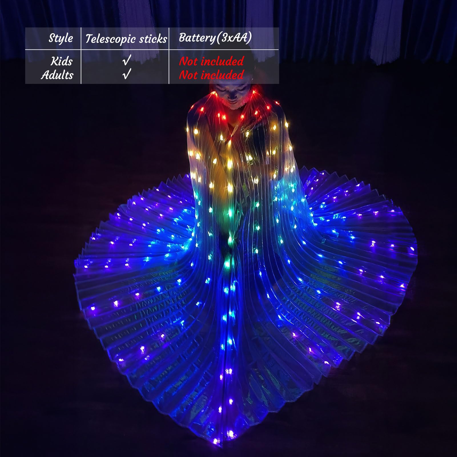 - Packing Details: 1 x LED Wings , 2 x PCS telescopic sticks, Powered by 3 AA batteries (Not Included).