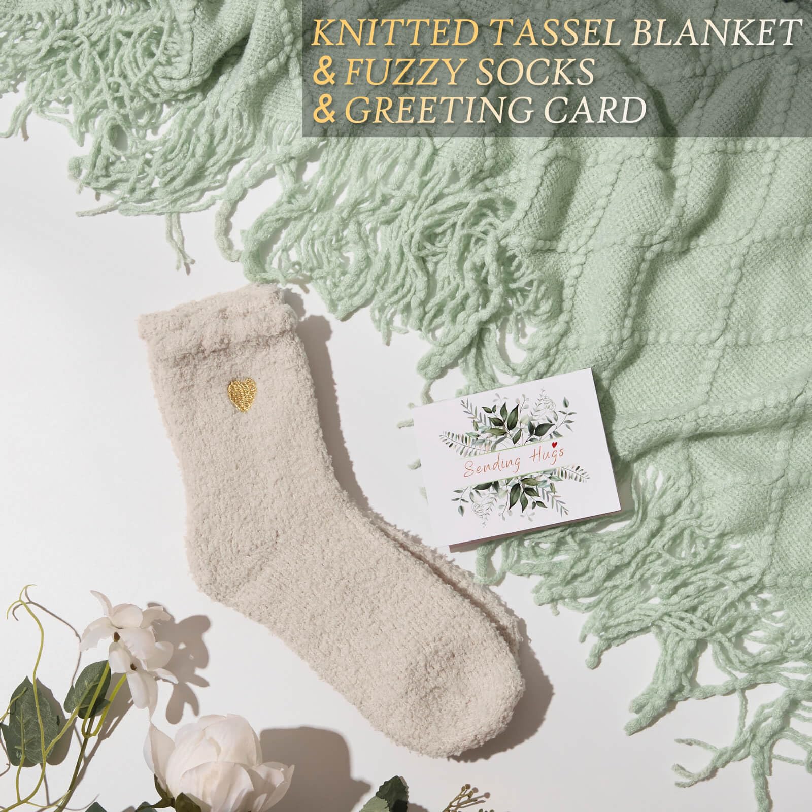 - LUXURY KNITTED TASSEL BLANKET: Ultimate Comfort in Every Thread The oversized knitted tassel blanket is ultra-soft, warm, and stylish — perfect for wrapping up on the couch. Paired with plush coral fleece socks, Just surround her in a love & warmth with this after surgery gifts feel better gifts to express your comfort and support