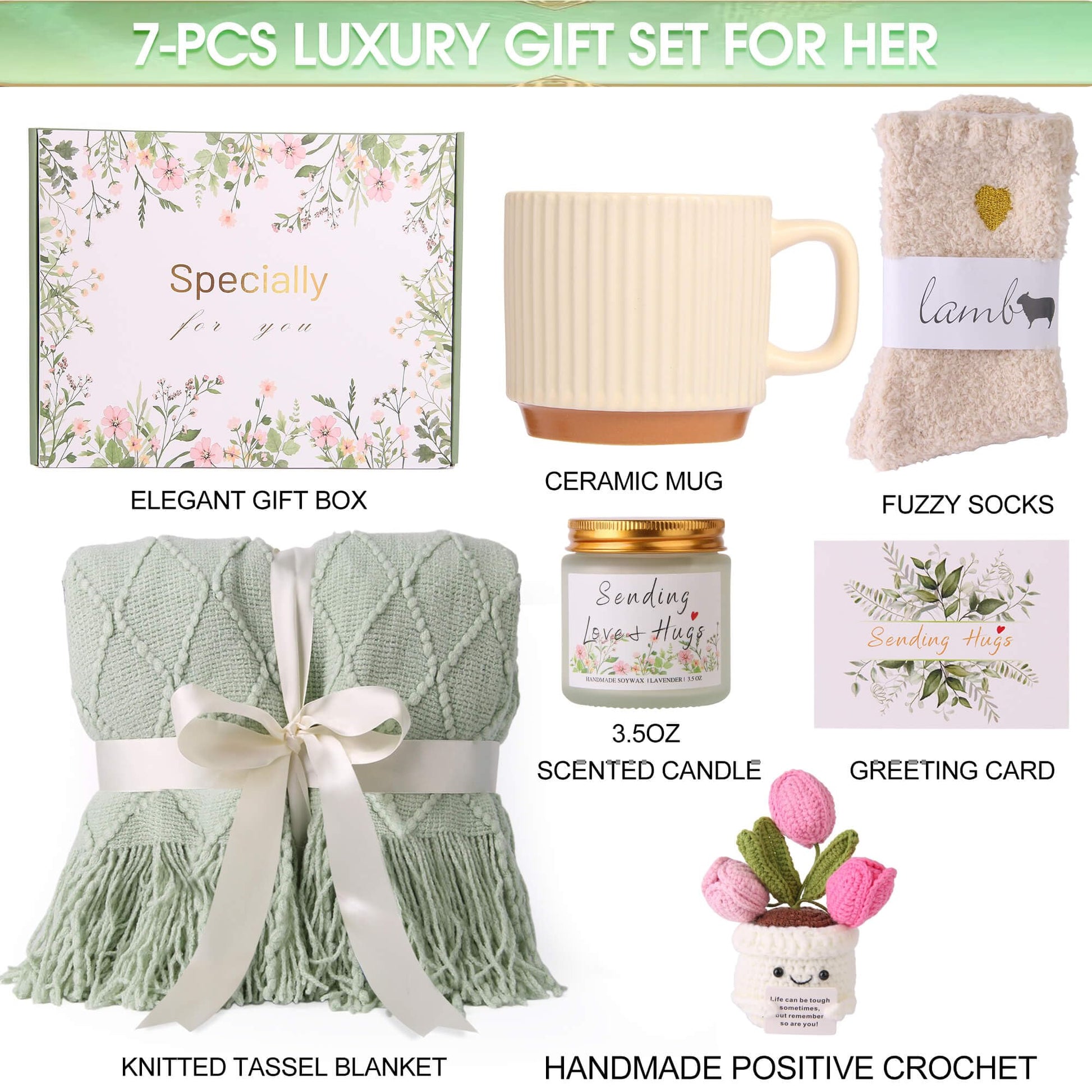 - THOUGHTFUL GIFT BASKETS FOR WOMEN: This luxury self care gift basket for women features (1) a 50x70 inch sage green knitted tassel blanket (2) a handmade positive crochet (3) a ceramic coffee mug (4) plush coral fleece socks (5) a scented candle (6) a greeting card (7)a beautifully designed gift box -designed to give her an unforgettable unboxing experience, serve as an unique birthday gifts for women her mom, best friends, sister, daughter, grandma, wife, girlfriend, coworker, etc