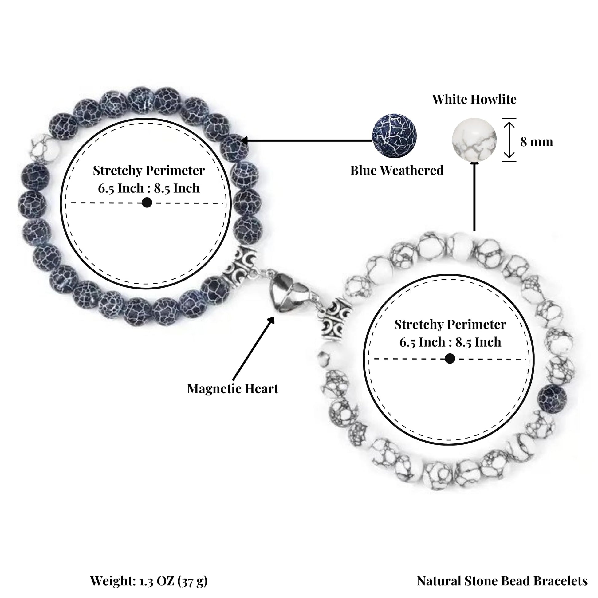 Set Of 2 Matching Couple Bracelets Magnetic Heart - Stone Beads, Stretch, Unisex Anniversary, Express Love, Valentine, Long Distance, Christmas Gift (Howlite+Blue Weathered, With Luxury Giftbox)